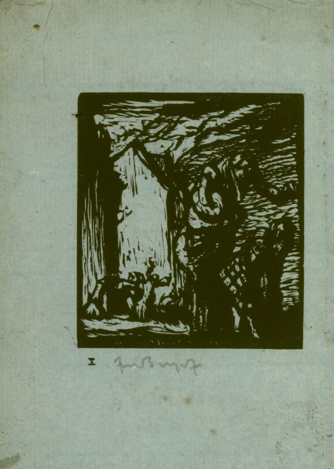 Woodcut on blue paper