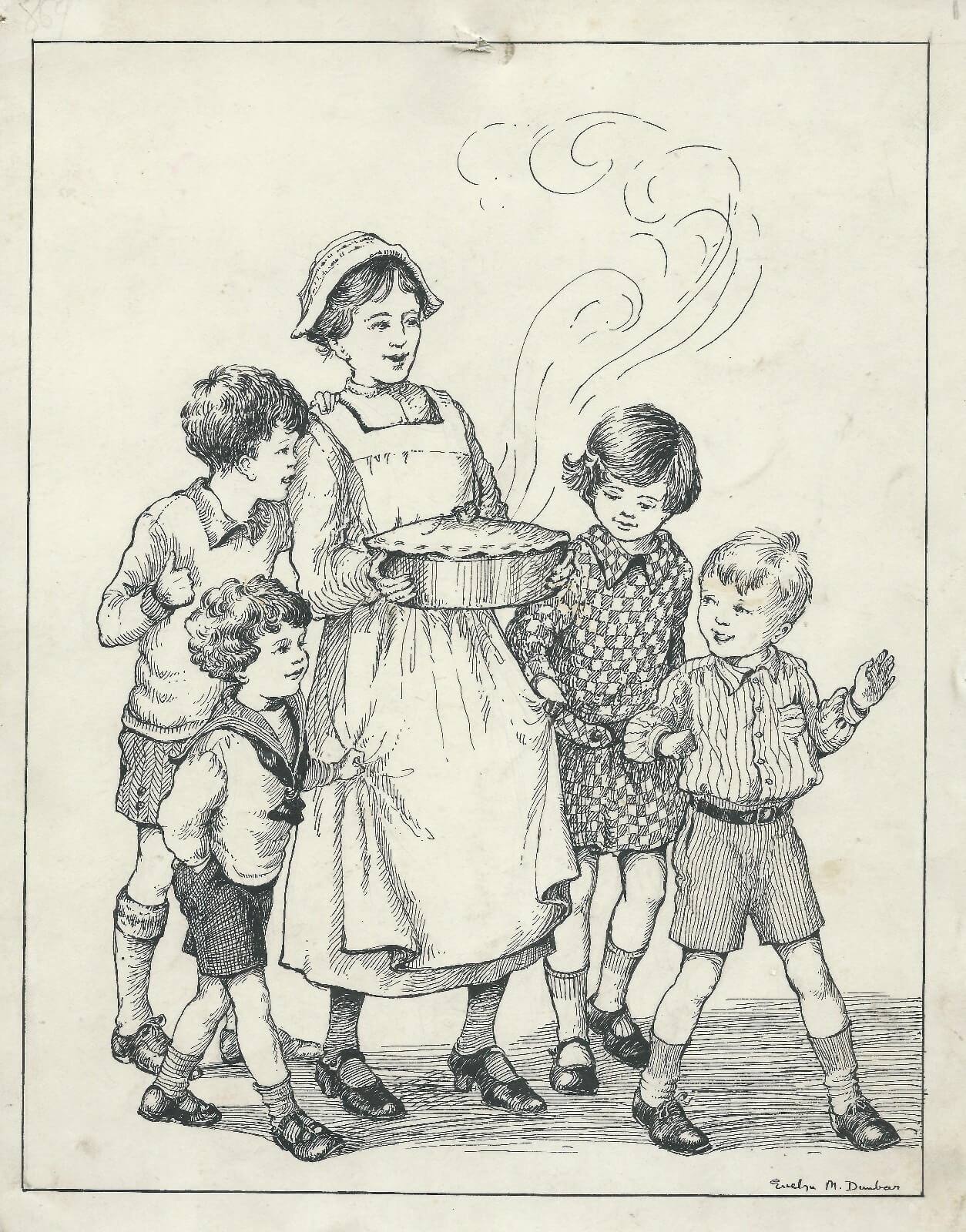 After leaving school in 1925 Evelyn spent a year at home, resisting the idea of going to art school. We do not know exactly why. It is possible that she had some impetuous ideas of earning her living as a professional artist. Sharing the tower studio at The Cedars with her mother, she had a little success with both writing and illustrating undemanding children’s stories with titles like Jolly Nice’, The Garden of Delight’ and Washing Day’, some published by Dean & Son, who also published Lucie Mabel Attwell and Enid Blyton. The meticulously drawn and agreeably bourgeois Hot Pie is typical of Dunbar’s work in this genre.