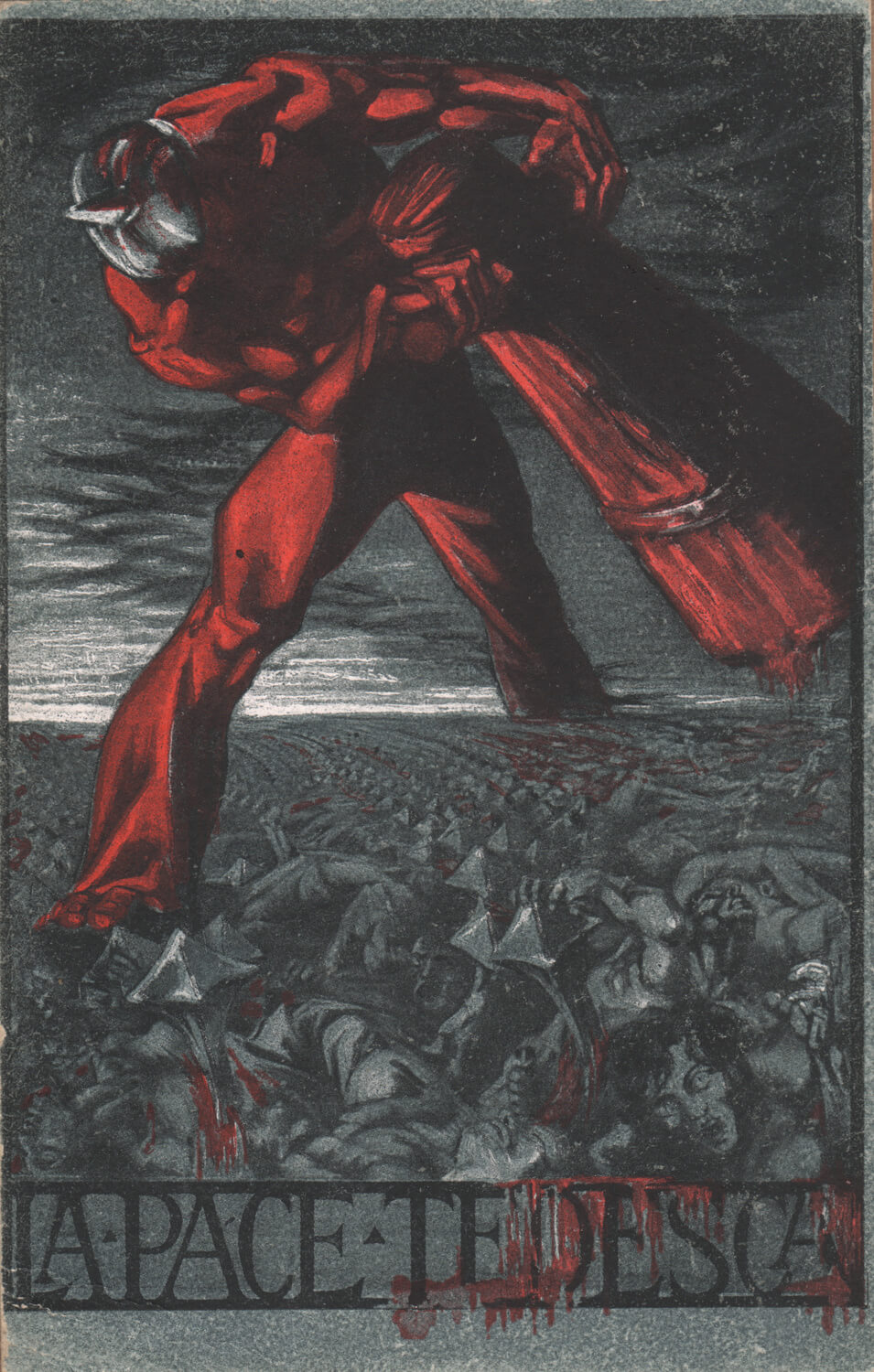 The original Italian propaganda poster of this image was published by Bergamo: Instituto Italiano d’Arti Grafiche in 1917 and measured 9 x 6 feet. There are only two known copies, one of which is in the British Library, the other in the Library of Congress. A powerful anti-German image, it depicts a giant, representing Germany, crushing bodies. This image is complementary to another Canevari design entitled Russian Peace.