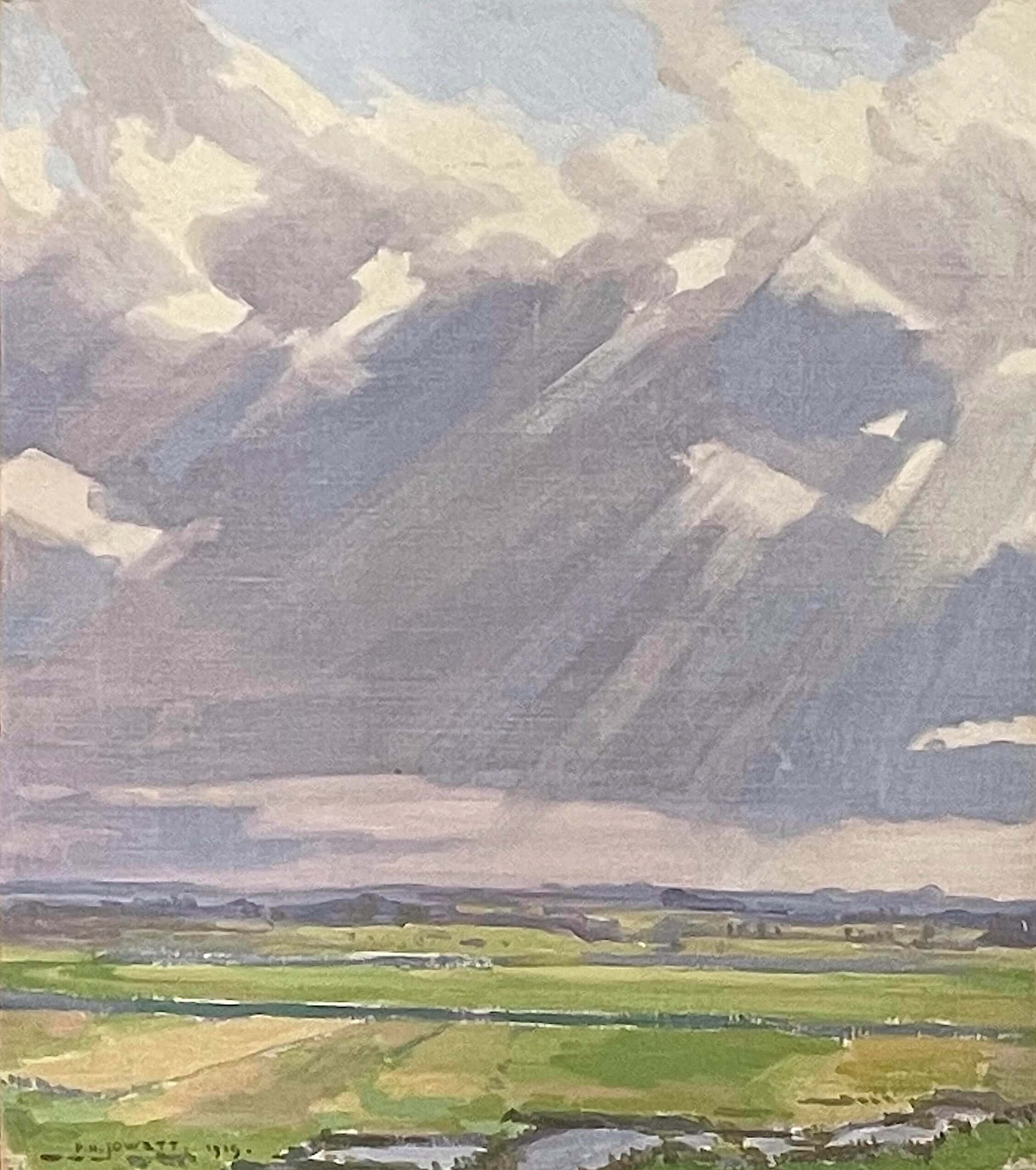 Jowett served with the Royal Garrison Artillery during the World War I, seeing action in Flanders and France. In 1920 he was one of the founder members of the 7 & 5 Society. The painter H.A.Finney remembered him as ‘a distinguished personality and this was a significant event for the school; he had returned from the war and at times suffered from shell-shock. He visited the school two or three days a week and by the inspiration of his teaching gained our confidence and almost hero worship, transferring his own enthusiasm for drawing, and the beauty of classical construction of the human figure, to all who came under his instruction. I remember still with clarity, his beautiful selective demonstration drawings, which we eventually cut out and treasured.” (Unpublished Autobiography of Hugh Finney, 1971, quoted by kind permission of Nicholas Finney)