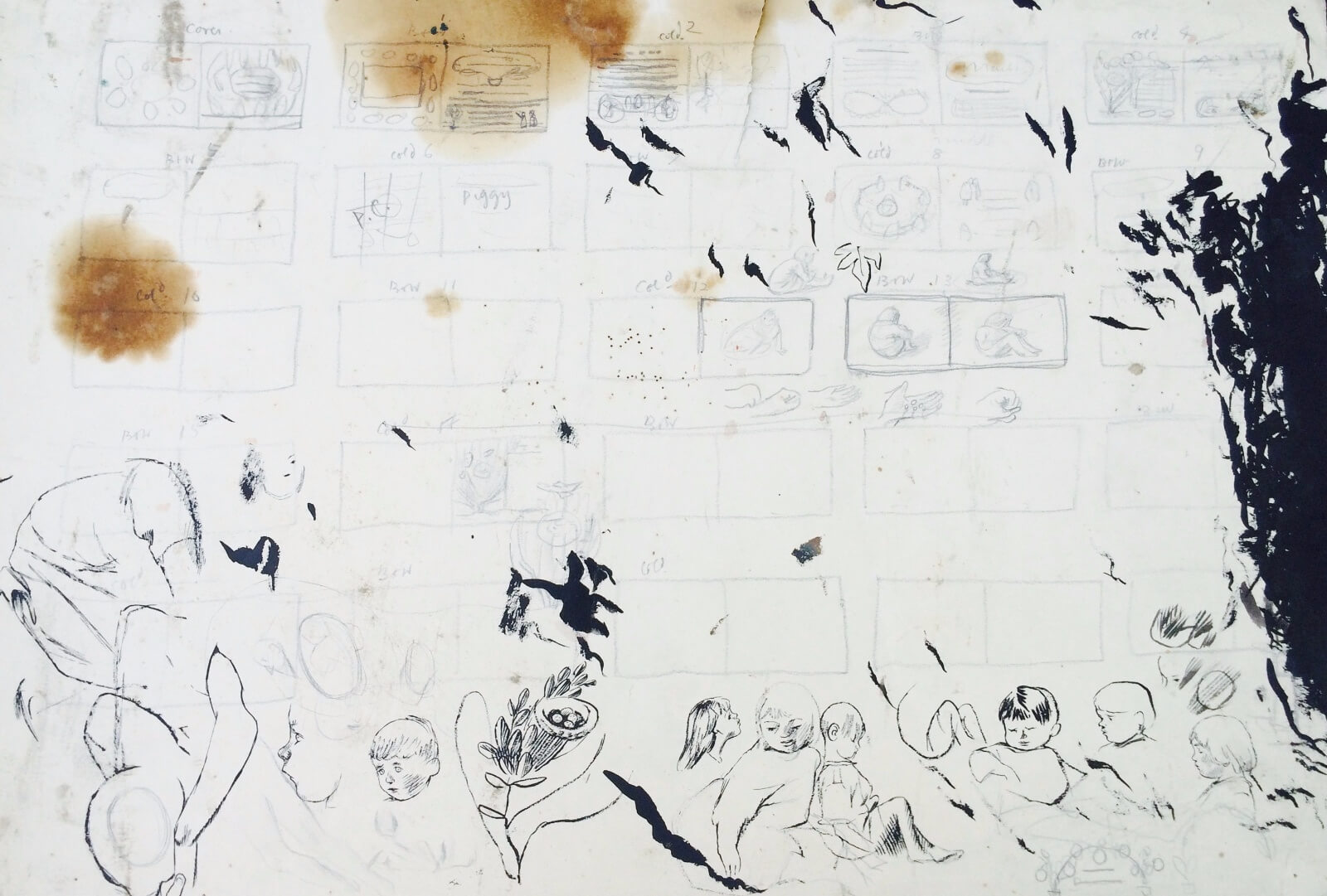 Layout for a proposed – but never realised – children’s book on an agricultural theme, with alternate monochrome (‘B&W’) and coloured (‘Col’d’) sheets. No date, but possibly contemporaneous with studies of children in various poses from circa 1948.