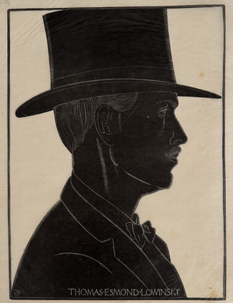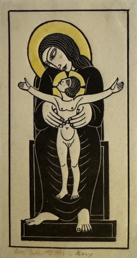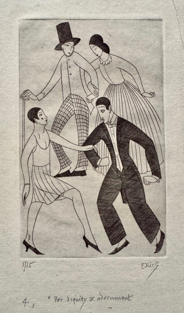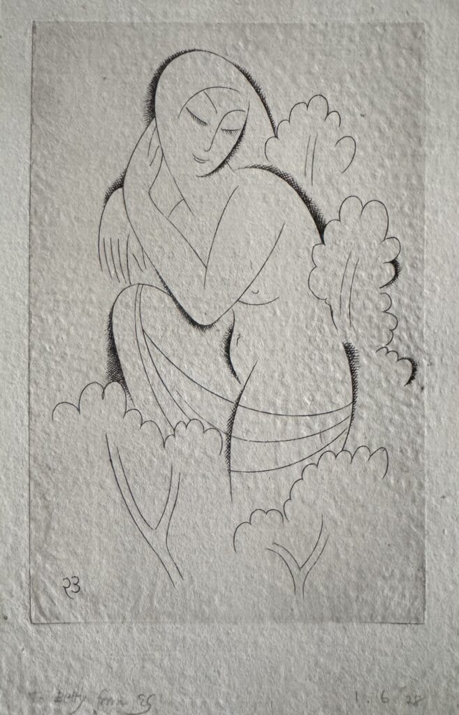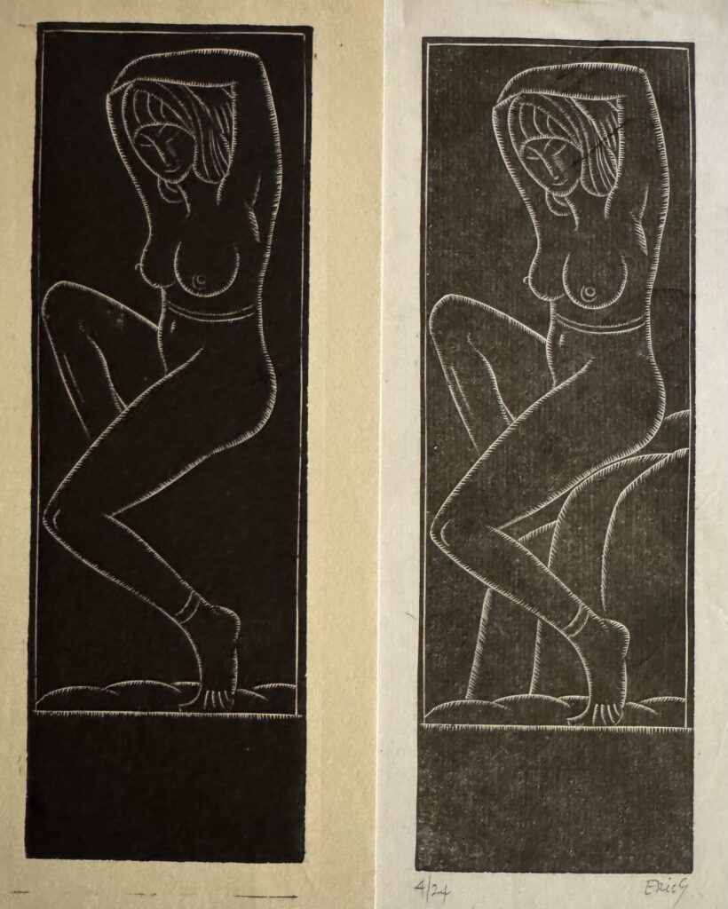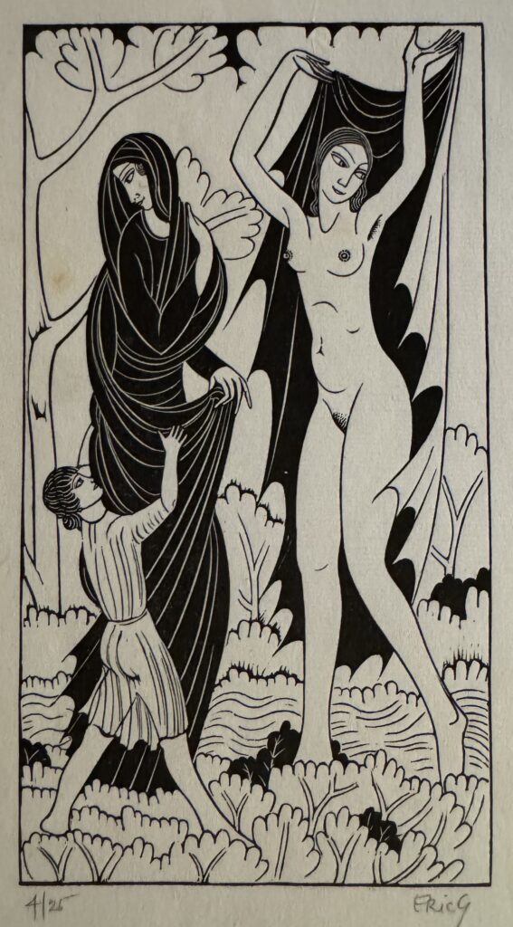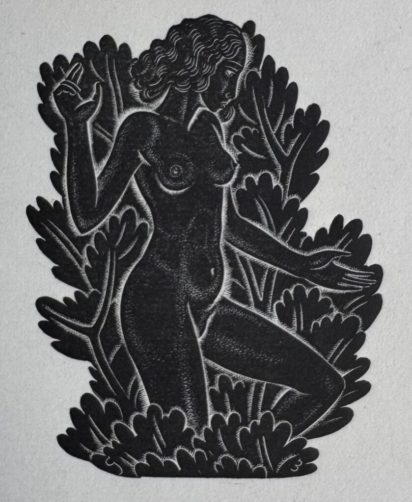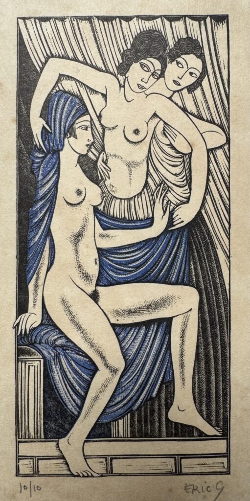 In 1924, he moved to Capel-y-ffin in Wales and over the next four years produced much of his greatest engraved work, mainly for Gibbing’s Golden Cockerel Press. He moved again to High Wycombe, Buckinghamshire in 1928 and though a controversial figure in that his sexual improprieties remained in conflict with his Catholic faith, Gill is nowadays regarded as one of the greatest craftsmen of the 20th century, a typographer and letter cutter of skill and a masterly wood engraver. Gill was appointed RDI in 1936 one of the Royal Society of Arts earliest recipients and was also a Fellow of the Royal Society of British Sculptors.