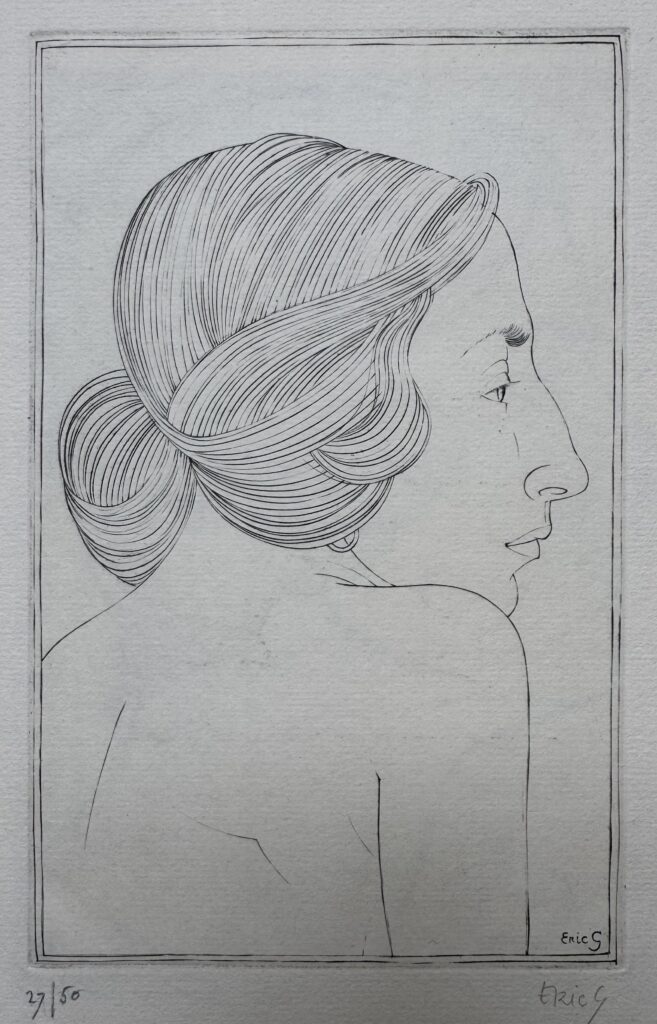 Sculptor, engraver, letter-carver and typographer, born in Brighton, Sussex, the son of a Congregationalist minister and always referred to as Eric Gill. He became articled to W.H. Carse, architect to the Ecclesiastical Commissioners in London in 1900. Gill attended evening classes at Central School of Arts & Crafts who studied letter design under Edward Johnston, he also began to carve in stone. By 1904, he was making a living from letter engraving and in 1910 began making figure sculpture and held his first solo exhibition at the Chenil Gallery, London, 1911 and about this time made several visits to the little-known Leeds Art Club. He set up an artistic community or artists colony in Ditchling, Sussex and was converted to Roman Catholicism in 1913.