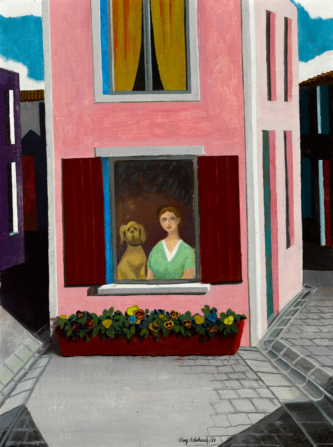 This image is full of the characterisitics that Adshead used to great effect throughout her career –  strong design, a daring palette, a division of space, humour and highly original use of collage with the three dimensional form of the flowers, shutters and window frame.