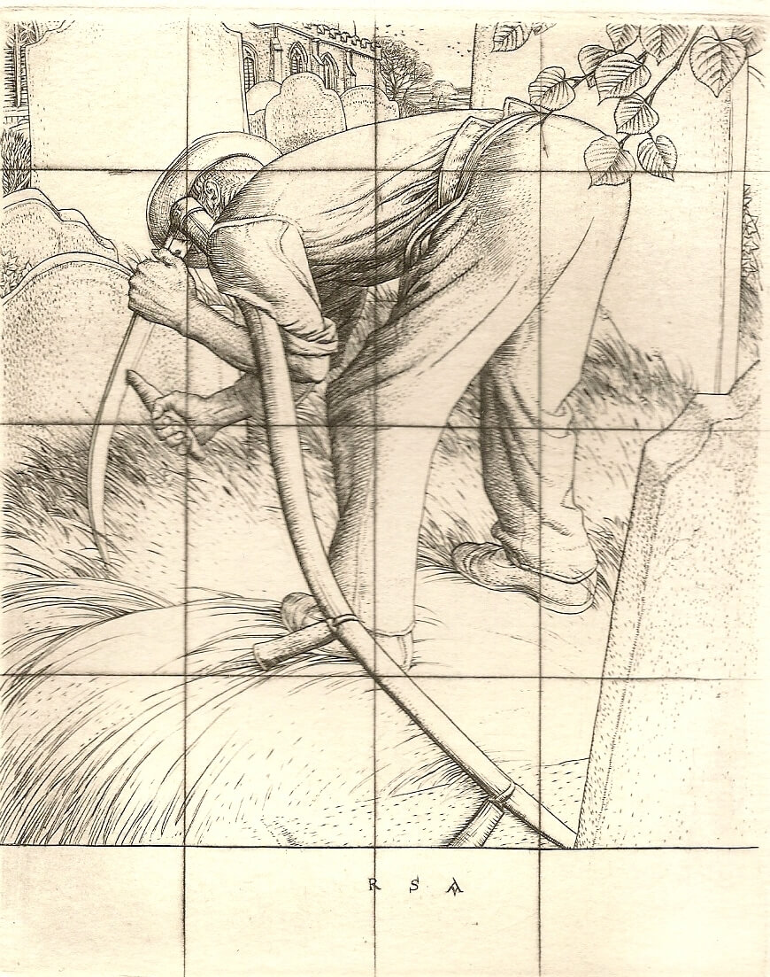 Austin’s latest plates are contemporary in subject. At the same time his interest in Millais, the Millais of book-illustrations, is explicit. Surely this strain, at once homely, intimate and romantic, is at the centre of the tradition of English art. Austin’s line remains clear: his tone is given by a number of short flicks and shadings. He is thus nearer in technique to the fifteenth-century German engravers than to Durer or Lucas van Leyden. In drawing and composition there is nothing archaic. Of recent years he has produced three or four plates regularly each year. Of these one or two commonly represent new treatments of subjects previously treated in a rather different way. He is fascinated with certain subjects, bells, stairs, kneeling figures, weathered wood.But he also advances to new subjects; in 1936 two very fine portraits and in 1937 the Young Mother.