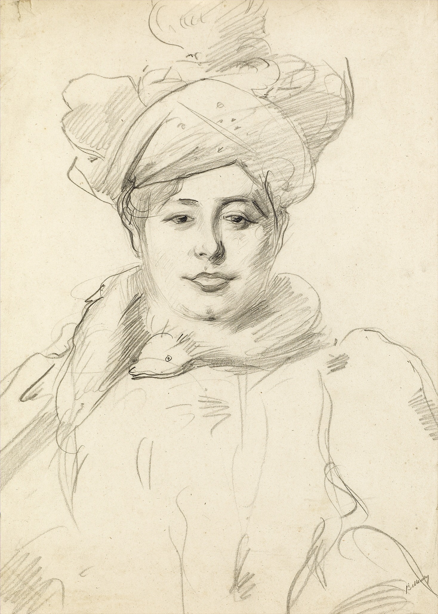 Along with Paul Helleu, Belleroche produced some of the most evocative images of belle-Èpoque women of his generation. Although Belleroche made a number of lithographs of women with turbans or toques around this period, none are known to relate specifically to this study.