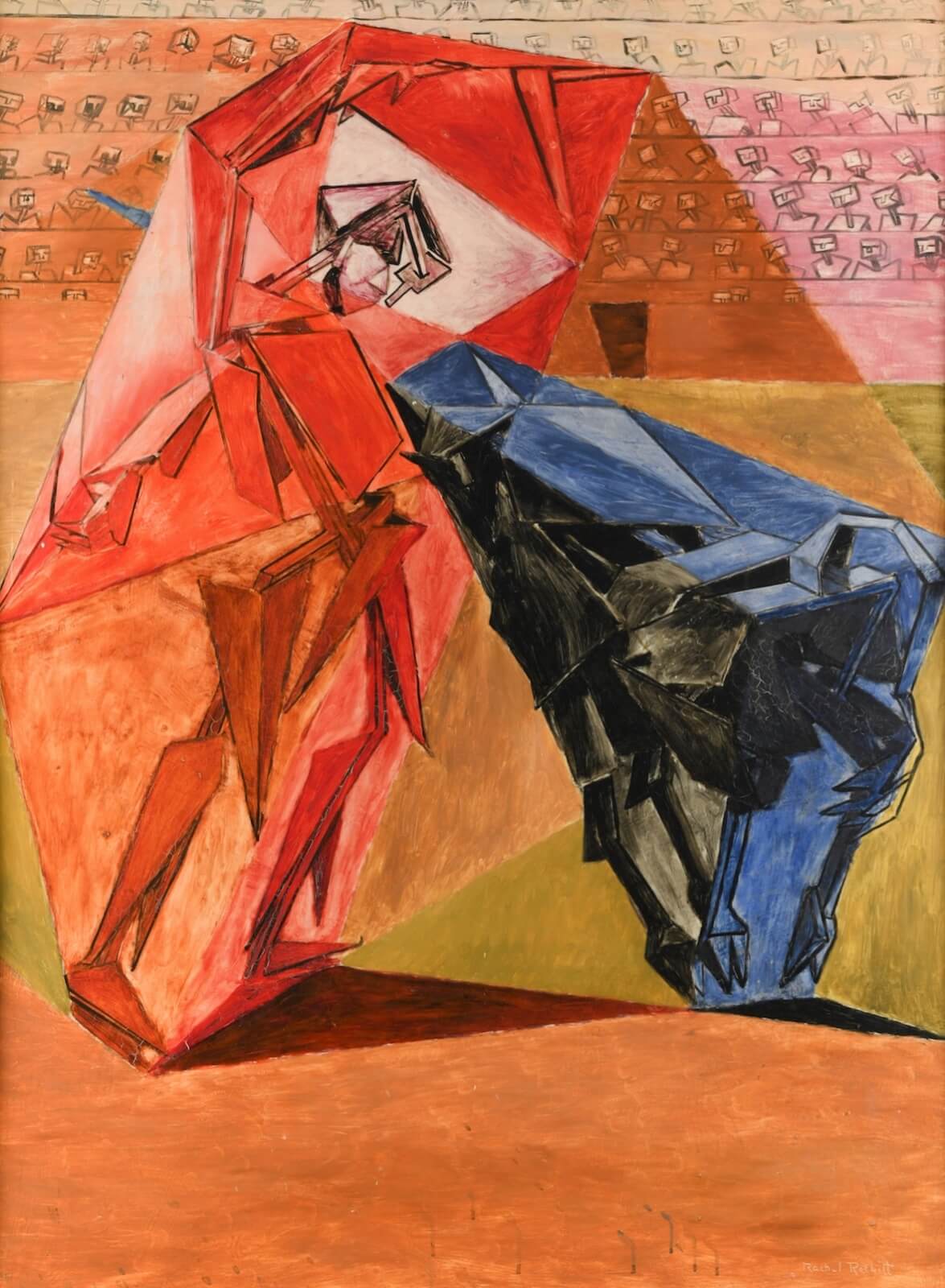 Reckitt studied wood engraving at the Grosvenor School of Modern Art in London from 1933 to 1937, where she was taught by the School’s founder, Iain Macnab. Although painted in oil, this work has all the hard-edge stylisation of a print, and stays true to the mission of the School in its rendering of ordinary subject matter with great movement and vitality.
