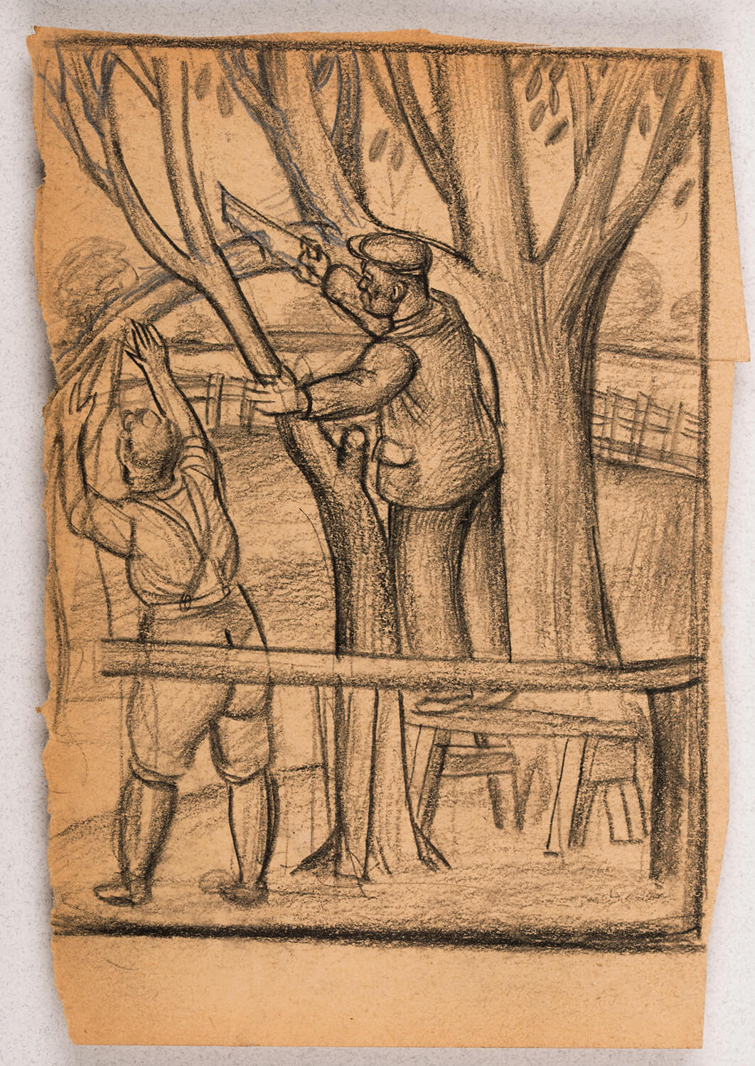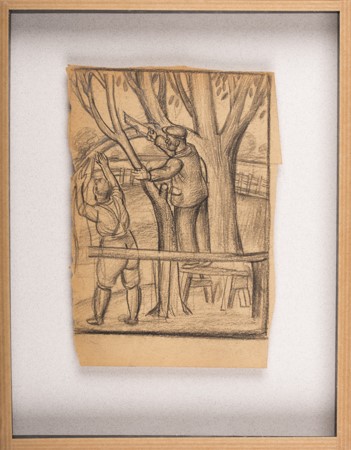 Stanley Lewis (1905-2009) was reluctant to sell his art during his life-time. He kept all his major works. He later gave some to museums. He turned down offers from galleries, preferring to work without constraints, choosing to earn a much needed regular income through teaching (over 10 years at Newport School of Art and 22 years as Principal of Carmarthen School of Art). Stanley’s art has period charm. It occupies a backwater (rather than the mainstream) of British Art – this is the unmapped territory that art historians will increasingly look at as accounts of 20th Century British Art are revised. His work is highly distinctive and he remained faithful throughout his life to a graphic and stylised manner developed early on in his career. Perhaps the most enduring aspect of his legacy is the remarkable cycle of paintings exhibited at the Royal Academy celebrating Welsh subjects: The Welsh Dress, The Welsh Mole Catcher, The Welsh Farmer, and The Welsh Dresser. There is arguably no other series of genre paintings in British Art which capture so evocatively Welsh identity. Stanley also strongly identified with the land: on the one hand his calling to art was a vocation; on the other his approach was disarmingly unpretentious: ‘I must admit instinct has kept me on the straight-and-narrow path to carry on working my art into what I am: I am a farmer’s son and I have never craved to be in any one else’s shoes.’ Stanley produced little in the way of major paintings during the last decades of the 20th century, though he did continue to draw, (often reworking earlier drawings), and increasingly put his energy into producing and publishing his book illustrations. In his 101st year, in 2006, Stanley published a last edition of drawings under the title: Adventures in Animal Town, using computer software (Photoshop) to add colour to the remarkable images which half a decade earlier, in black and white, had graced the pages of the South Wales Evening Post. (Fig. 2) Stanley first contacted Liss Fine Art (by email!), aged 101, wanting to know what had happened to his former mentors Thomas Monnington and A.K. Lawrence. Stanley’s career spanned a large part of the 20th century. Yet the fruit of his labour was never publicly exhibited. This is the first ever exhibition of his work. Stanley put his longevity down to cigars, whisky and Michelangelo. He took great pleasure in helping prepare the notes in this catalogue. Recalling events from between 50 and 90 years ago it is remarkable how accurate his memory proved to be. It is sad that Stanley is not alive to see this exhibition. Asked, age 103, if he was finally ready for his first ever show, or whether he would like a little more time to prepare, he inhaled gently on his cigar and, with a puff of smoke and a faint chuckle, said: ‘I think I am ready’. The day before he died he asked Jenni his daughter to type up his final wishes: ‘… And when my exhibition is up and running, open a good bottle of champagne and celebrate and think of me. No doubt I will be there in spirit to keep an eye on things.