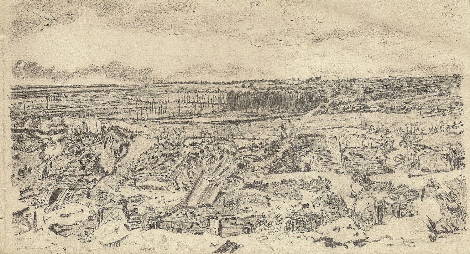 This very detailed panoramic view from the British trenches is very close  in composition  to Charles Sims’ painting ‘The Old German Front Line, Arras, 1916’ (The Edwardians, Fine Art Society Catalogue 2011, p.69).