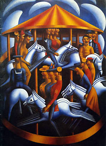 to emerge in the inter-war years.  This woodcut, which appears to have never been printed as an edition, is clearly inspired by Gertler’s iconic Merry-Go-Round, 1916.  The figures on the carousel are here replaced by miners, adding resonance to an already politicized image.