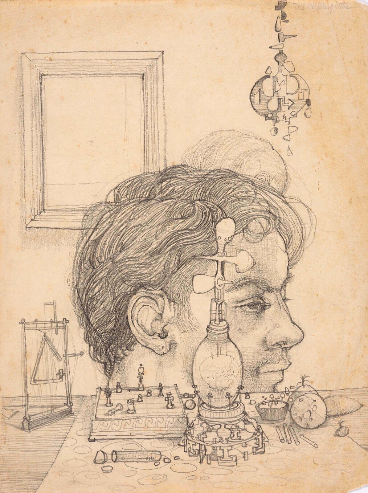 The highly distinctive large scale watercolours of David Evans have much in common with those of Edward Burra, who, twenty four years his senior and much admired by Evans, was clearly an important influence. Painting the landscape of his native Suffolk, where he settled (near Woodbridge) in 1969, his brightly coloured compositions, which typically measure 30 x 50 inches, fused his local habitat with vivid fantasies inspired by imagery from contemporary life.