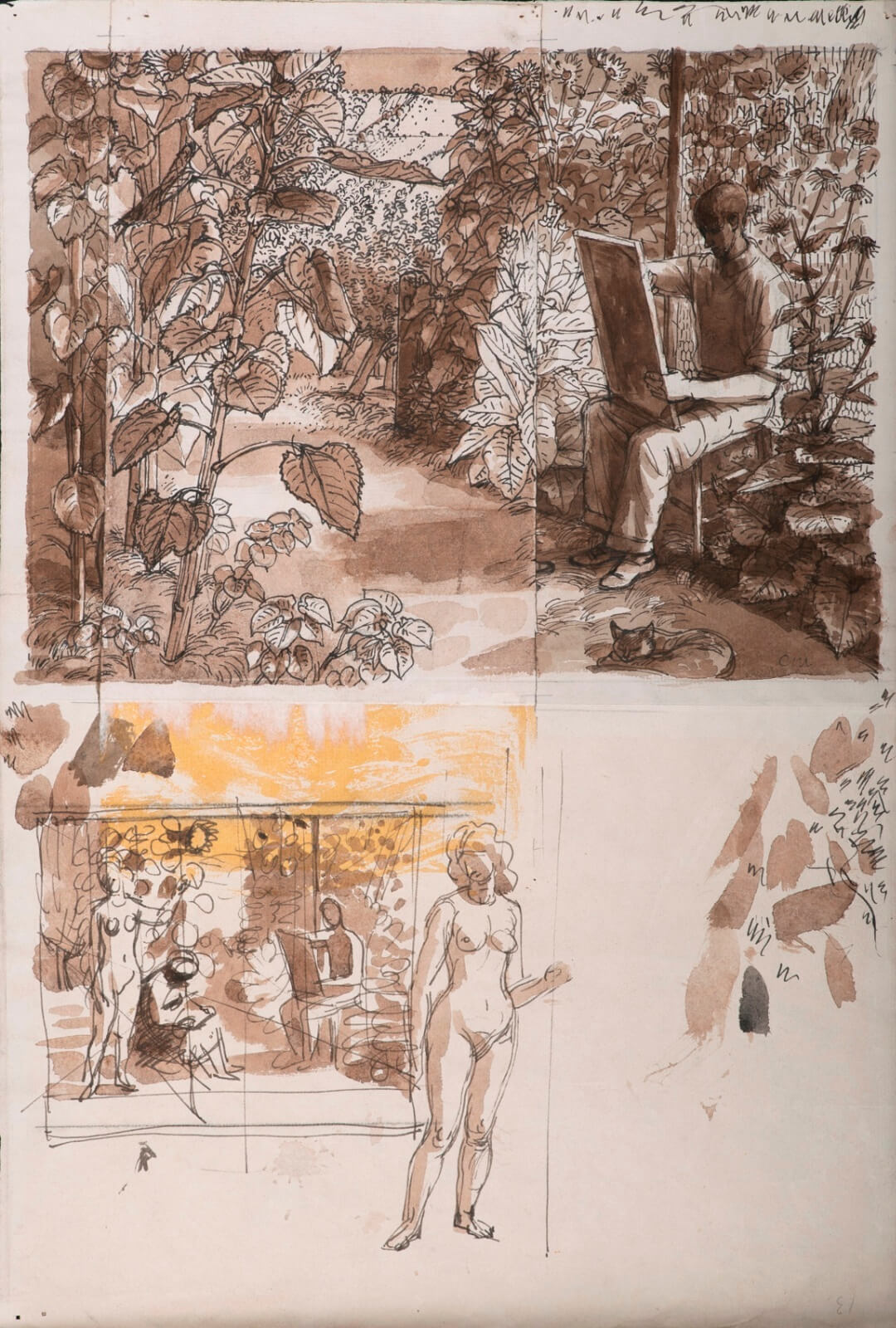 Pen and ink, wash and highlights in yellow watercolour.