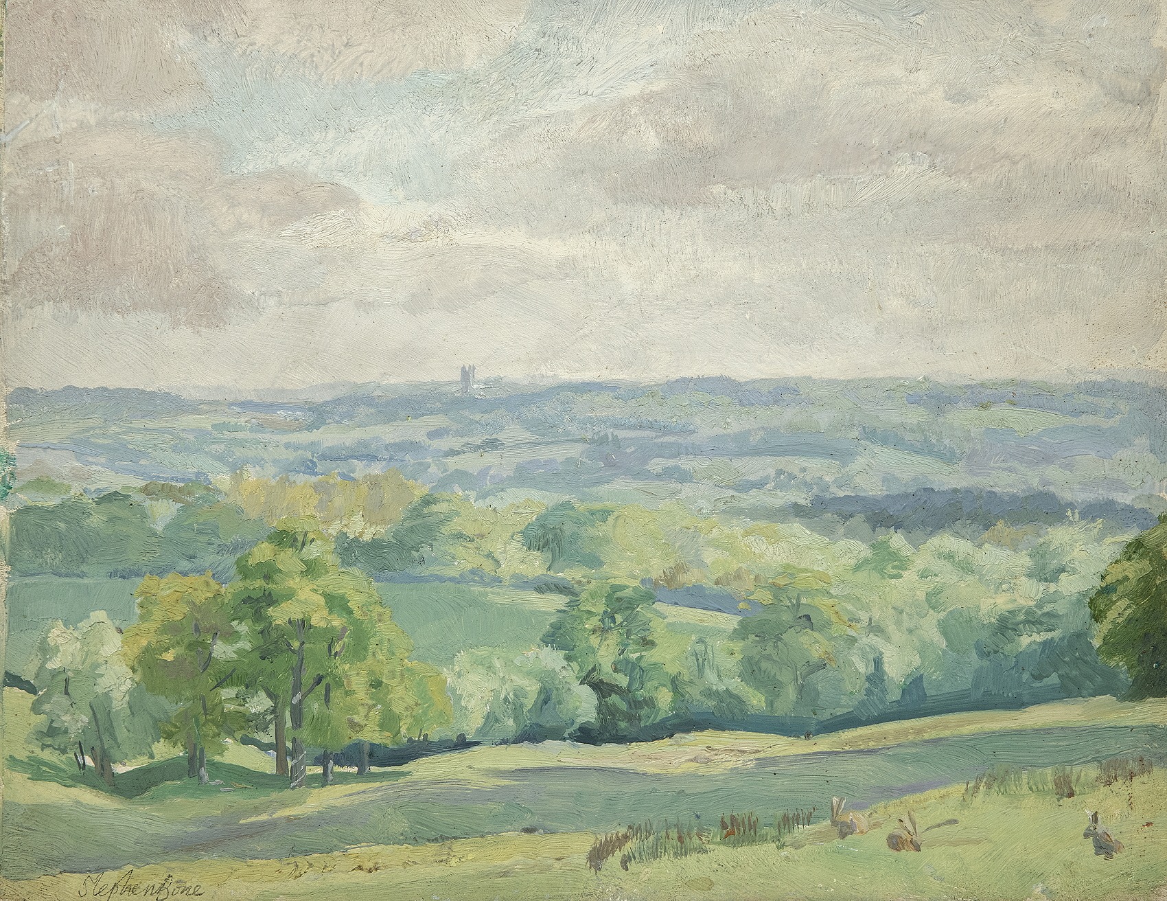 Signed. Inscribed on verso ‘Near Horsham, Sussex – Stephen Bone’. Oil on panel