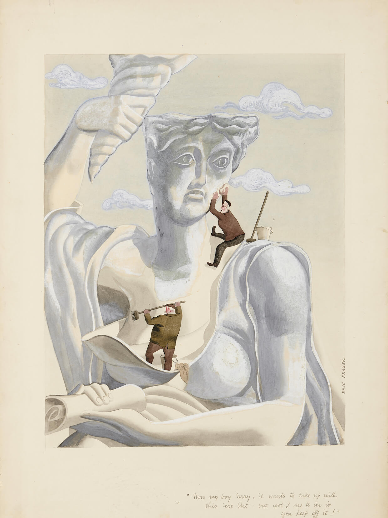 Born in Westminster, London, Eric Fraser attended evening classes at Westminster Technical Institute under Walter Sickert, and later studied at Goldsmiths’ College, 1919-25. In 1926, he received his first commission from the Radio Times and continued to work for this publication until his death. Fraser also executed designs and illustrations for Lilliput, for the Folio Society and for Vogue, as well designs for murals and postage stamps, all displaying that disciplined vitality that is the keynote to his illustrative style.