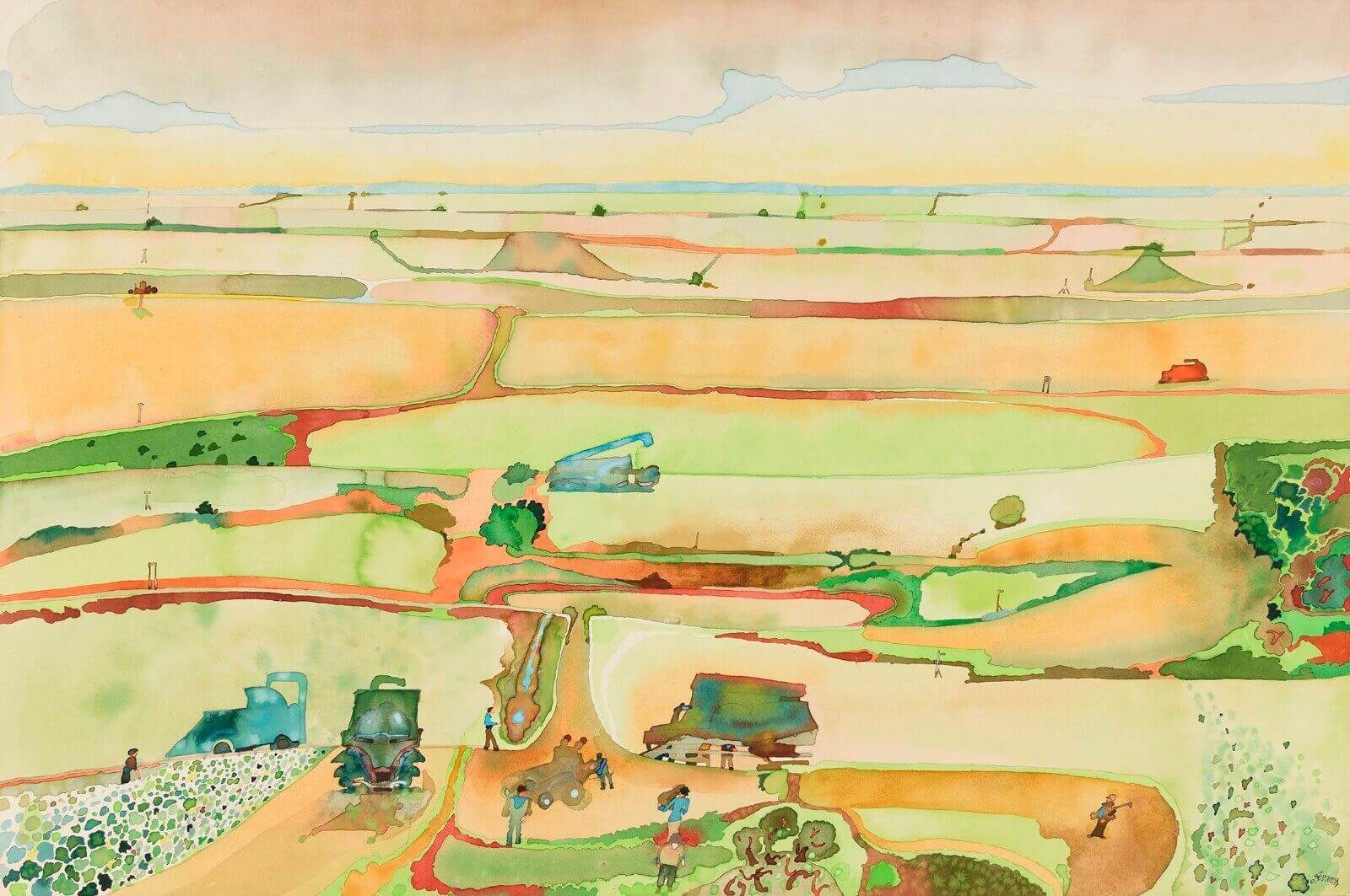 He was a ardent campaigner and environmentalist and the effects of pollution in the form  of landfill, industrial plants and roads encroaching into his landscape are regular motifs.  He was also drawn to metropolitan subjects – rock bands, cafeterias, excursions to museums and days out to the beach.