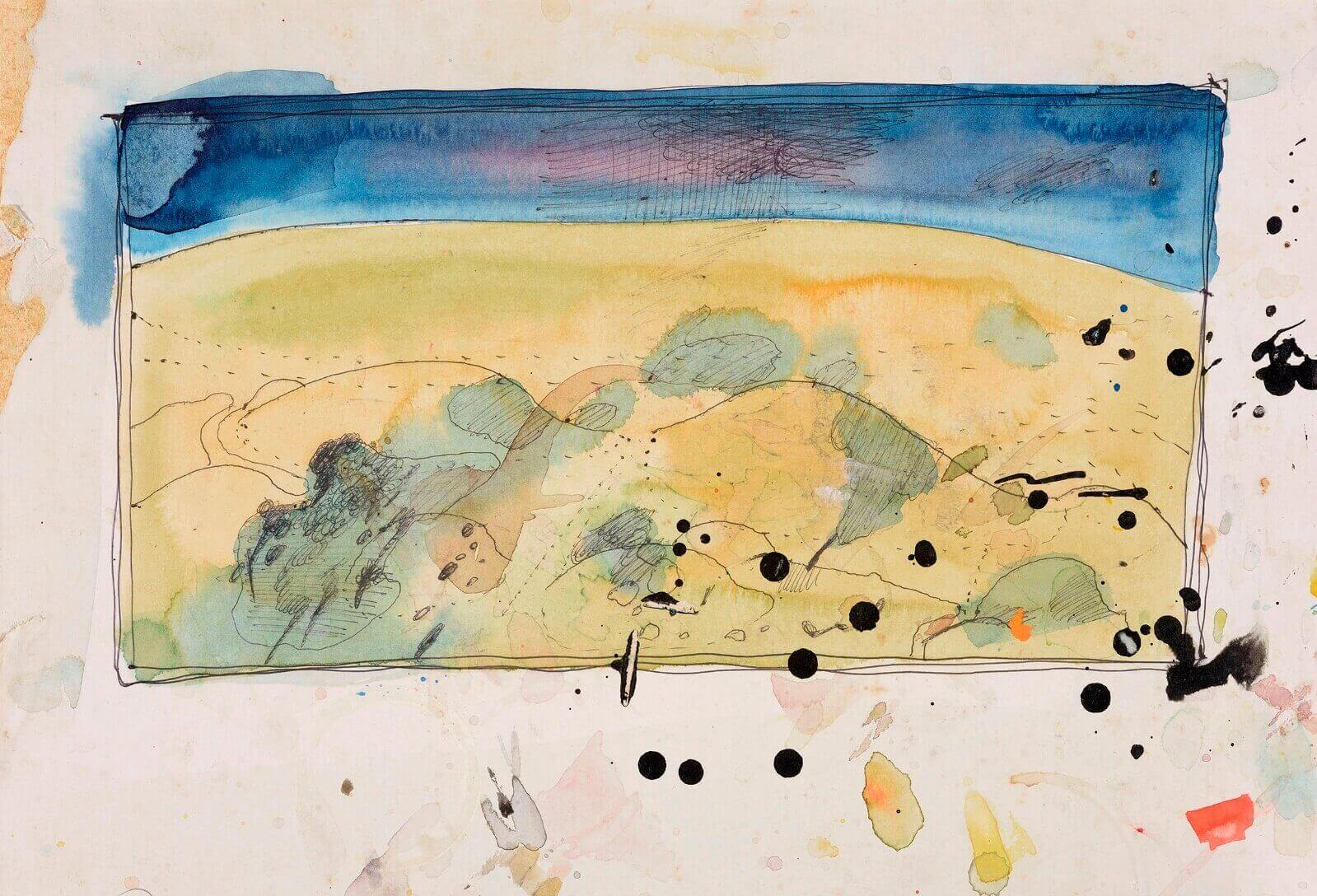 The highly distinctive large scale watercolours of David Evans have much in common with those of Edward Burra, who, twenty four years his senior and much admired by Evans, was clearly an important influence. Painting the landscape of his native Suffolk, where he settled (near Woodbridge) in 1969, his brightly coloured compositions, which typically measure 30 x 50 inches, fused his local habitat with vivid fantasies inspired by imagery from contemporary life.