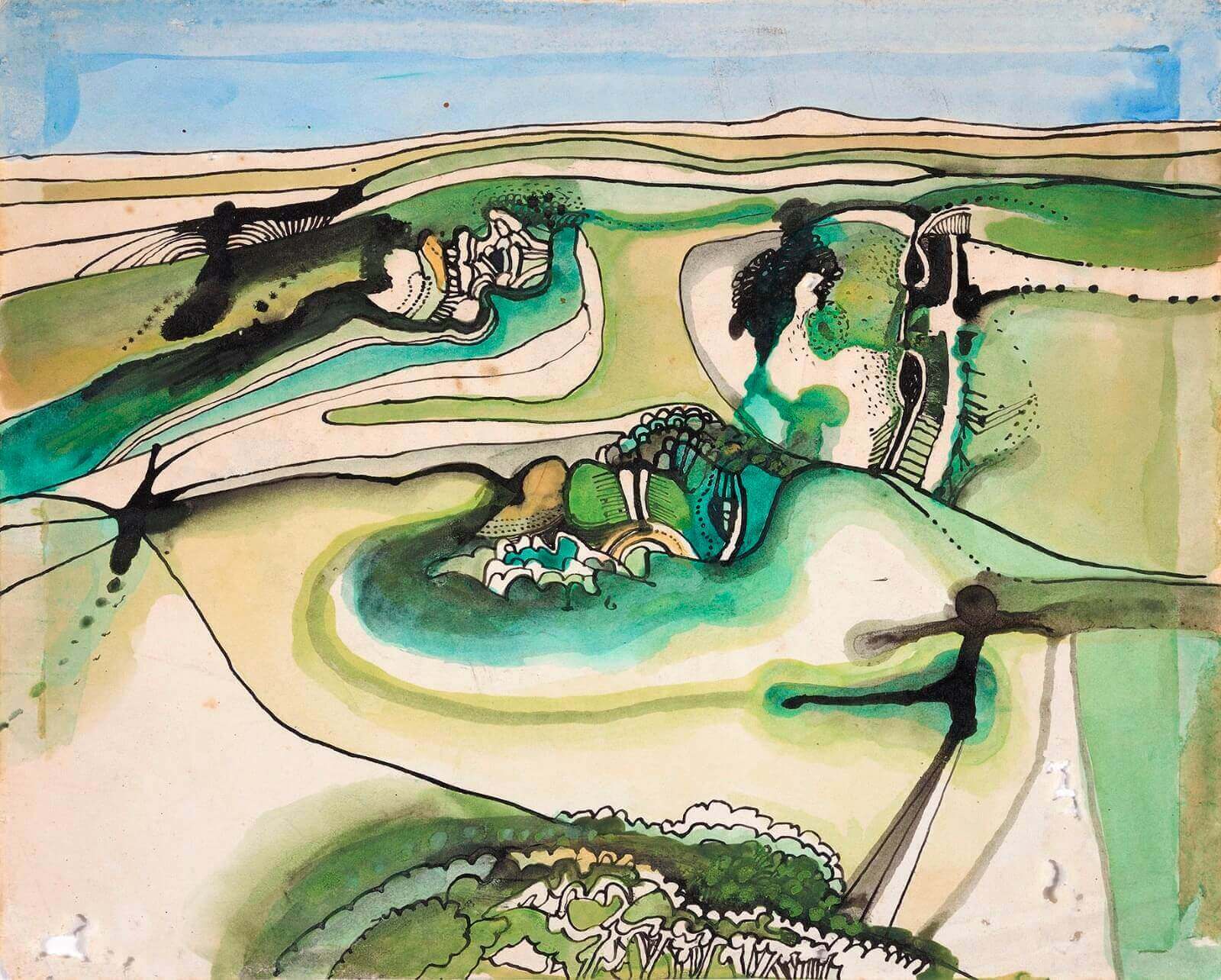 The highly distinctive large scale watercolours of David Evans have much in common with those of Edward Burra, who, twenty four years his senior and much admired by Evans, was clearly an important influence. Painting the landscape of his native Suffolk, where he settled (near Woodbridge) in 1969, his brightly coloured compositions, which typically measure 30 x 50 inches, fused his local habitat with vivid fantasies inspired by imagery from contemporary life.