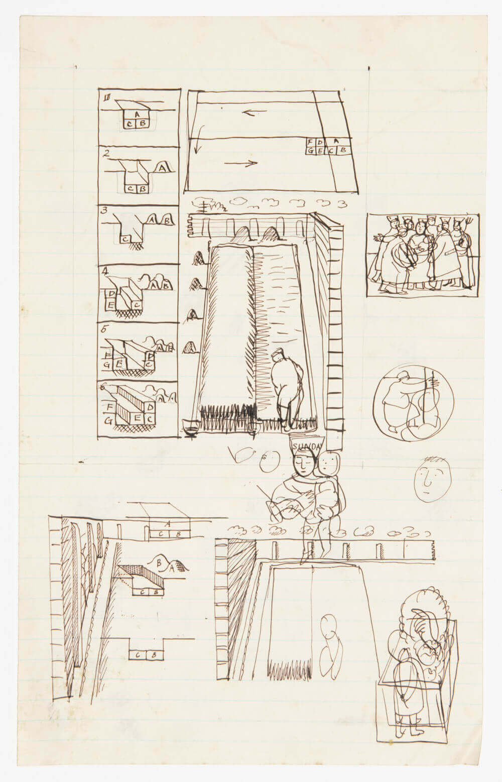 A diagrammatic explanation of trenching or double digging, prepared for an unidentified gardening manual. The buttressed garden wall can be associated with the wall at The Cedars, the Dunbar family home in Strood, Rochester. As is often typical of Dunbar’s sketch work, other unconnected images appear, in this case a figure holding a ladder and a baby held by its mother wearing a hat inscribed ‘Sunday’.