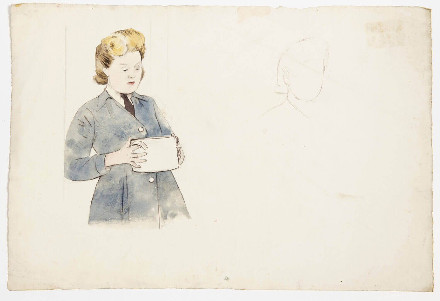Posted by the War Artists’ Advisory Committee to RAF South Cerney to observe and record the activities of the Women’s Auxiliary Air Force, Dunbar was limited to non-operational centres like the canteen. Here an Airwoman clutches a deep saucepan