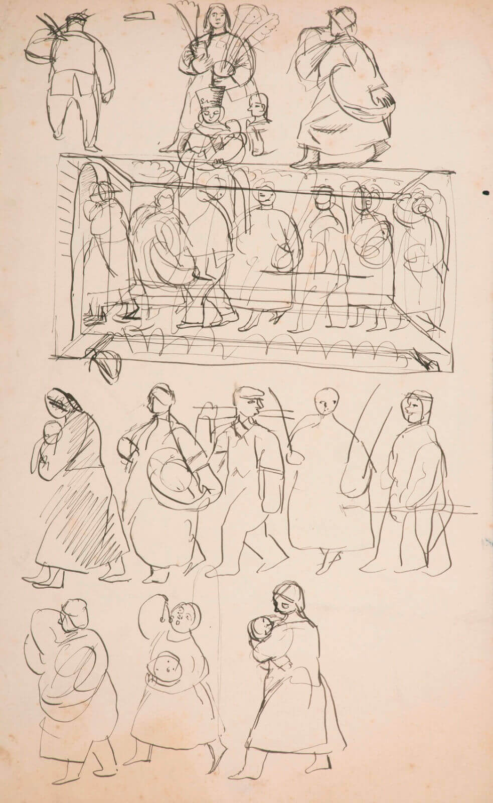 A very early sketch for what would become one of Dunbar’s greater and more reflective paintings. Dunbar called the period 1937-1940 her ‘crisis’ years: break-up of her relationship with her fellow-artist CharlesĀ Mahoney; failed pregnancy; religious doubts (Dunbar was a committed Christian Scientist); no earnings, obliging her to work behind the counter in her sisters’ children’s clothes shop. Eventually she arranged many of the characters and what they stand for in this sheet of sketches into a kind of procession through the week.
