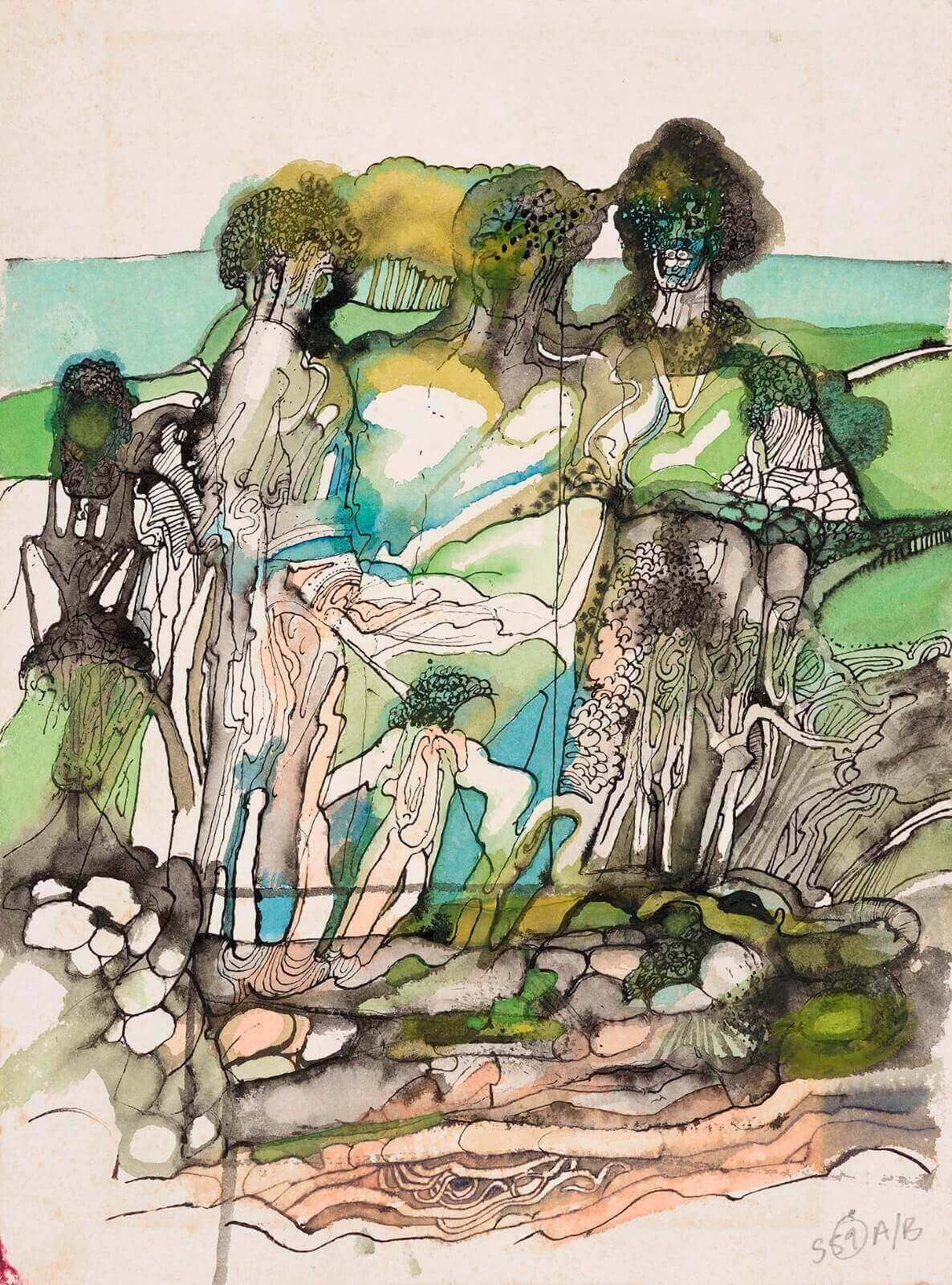 The highly distinctive large scale watercolours of David Evans have much in common with those of Edward Burra, who, twenty four years his senior and much admired by Evans, was clearly an important influence. Painting the landscape of his native Suffolk, where he settled (near Woodbridge) in 1969, his brightly coloured compositions, which typically measure 30 x 50 inches, fused his local habitat with vivid fantasies inspired by imagery from contemporary life.