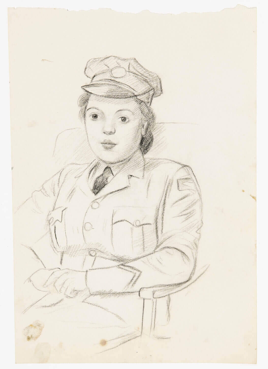 Posted by the War Artists’ Advisory Committee to RAF South Cerney to observe and record the activities of the Women’s Auxiliary Air Force, Dunbar was limited to non-operational centres and had to rely on portraiture to complete her portfolio. Nothing is known about this Airwoman apart from the inverted chevron on her sleeve, awarded for Good Conduct. The finished portrait, Portrait of an Airwoman 1944 RAF Museum, Hendon, shows additionally her engagement ring.