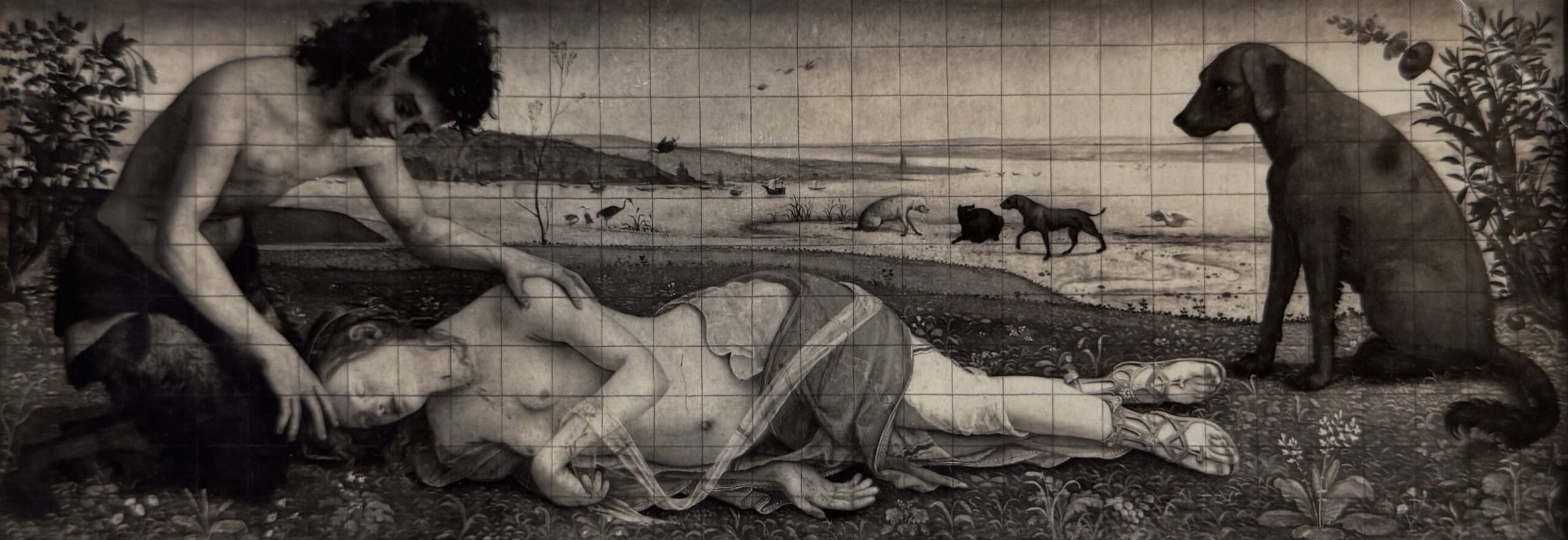 A nymph – a mythological spirit of nature imagined as a young woman – lies on a patch of grass in the foreground, blood streaming from wounds on her throat and hand. A satyr, half man and half goat, kneels next to her, mourning her death. A dog sits at her feet, balancing the stooping figure of the satyr and seemingly mourning as well. More dogs appear at the lakeside in the background.