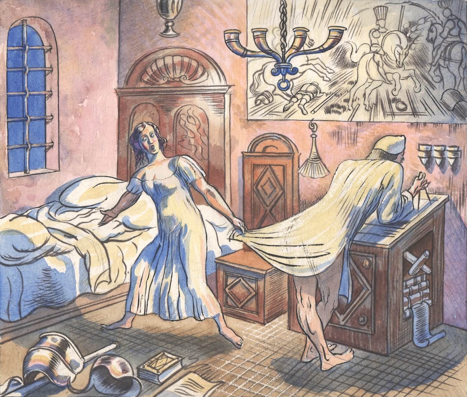 These are mostly French but Stubbs, Morland, the Pre-Raphaelites and Haydon appear from England, and Goya from Spain. Other pictures outside the two groups show John Donne posing for his sculptured portrait in his shroud, Rembrandt in shades of gravy brown and a handsome Vel√°zquez painting hideous Spanish royals. Subtitles helpfully explain some of the painter’s research sources. They are a tour de force and deserve to be published in book form as Douglas intended, although the reader would need a comprehensive knowledge of art history to appreciate their full drollery. They were exhibited in 1934, 1937 and in 1938 to positive reviews; some sold, but no publisher came forward to encourage him to continue with them, or with the literary figures he planned to satirise next’.
