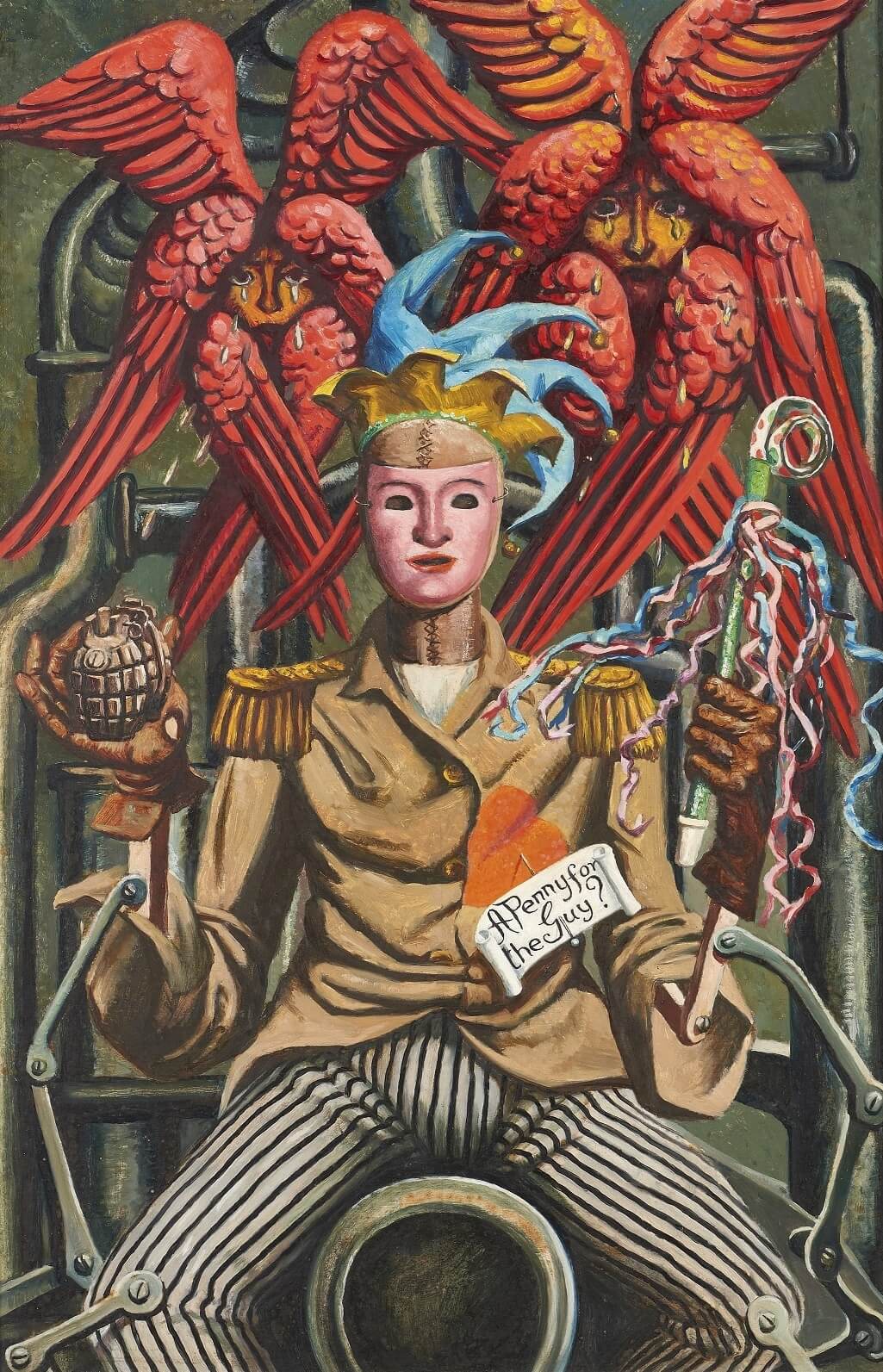 Painting in Britain and Germany was famously haunted by World War One and its aftermath, but Gladys here addresses the just war’: its sequel, as early as 1940, when Europe ‚Äì apparently doomed ‚Äì was yet to learn the worst about the Third Reich.Her subject is not war or the pity of war, but those of whom Bob Dylan wrote in his great Masters of War: ‚ÄúYe that build the big guns‚Äù. Gladys’ Master of War’ wears a pallid mask, evocative of James Ensor, to give him oblique indifference; ‚ÄúYe that hide behind walls / Ye that hide behind desks‚Äù, wrote Dylan. He is bane and demoniac, while Gladys was a devout Catholic.What this man does makes even the Angels weep; for Dylan, ‚Äúeven Jesus would never forgive what you do‚Äù.