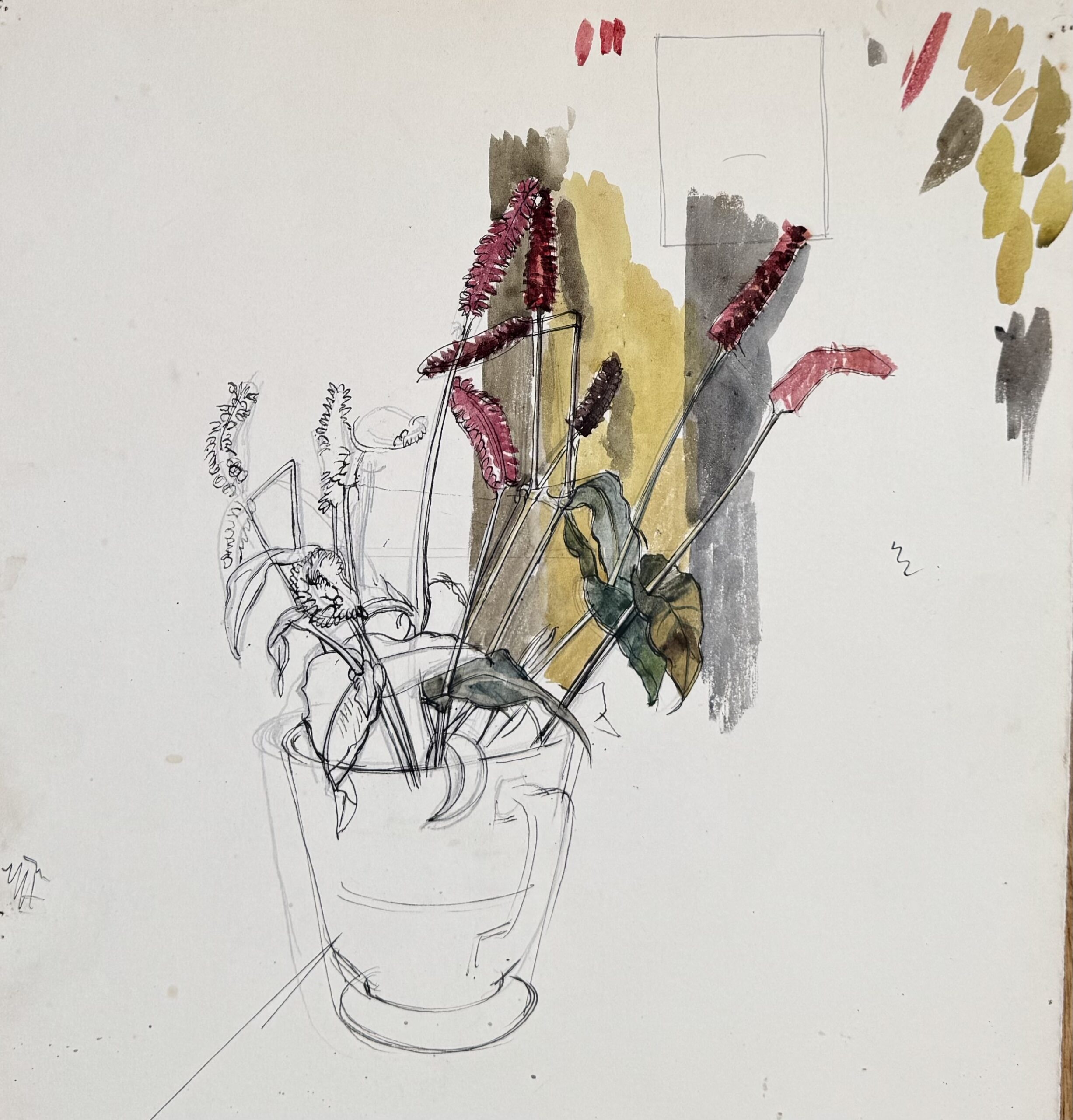 Mahoney’s interest in formal gardens and plants such as auriculas and old roses “all deeply unfashionable at the time” is typical of the originality and independence of his vision. His unbridled enthusiasm for plants was shared with Edward Bawden, Geoffrey Rhoades, John Nash and Evelyn Dunbar, with whom he swapped cuttings by post. The correspondence between this circle is full of exchanges about the discovery, nurturing and drawing of new potential subjects. Mahoney’s plant studies are so remarkably complete in their own right that it is barely possible to attempt to mark a line between botanical study and still life. The two became one and the same; and although some of his compositions were clearly arranged, they rarely appear contrived.