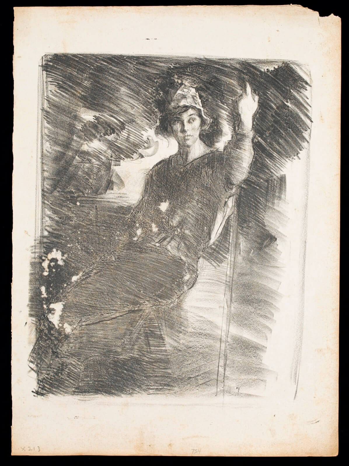 Although born in Wales, he was the son of the Marquis de Belleroche, of one of the most ancient French noble families who, being Huguenots, had fled to England in 1685. In 1871, following the death of his father, he moved back to Paris with his family. After he had finished school there, he studied at the studio of Carolus Duran, and spent long hours copying at the Paris museums. He soon became familiar with the leading painters and intellectuals of the day, and became a founder member of the Salon d’Automne, exhibiting alongside the Impressionists and associating with Emile Zola, Oscar Wilde, Albert Moore, Renoir, Degas, Helleu and Toulouse-Lautrec. Toulouse-Lautrec and Belleroche were exact contemporaries, who first met at the age of eighteen. Belleroche painted Toulouse-Lautrec’s portrait and shared with him a passion for the model Lili, who epitomised the Belle Epoch aesthetic of Toulouse-Lautrec’s most celebrated posters. Lili became Belleroche’s favourite model and mistress. In 1882 Belleroche also met the already acclaimed American painter John Singer Sargent, who recognised Belleroche’s talent and empathised with his free drawing style and sensitivity to light. They became life-long friends. Sargent’s handling of pastel was a great inspiration to Belleroche, while Belleroche’s sensitivity to tone and creation of form through the modeling of light exerted a strong influence on Sargent. In 1900, Belleroche became fascinated by the medium of lithography and by 1905 he was a leading figure in the field of lithographic portraiture. A.M. Hind, a former keeper of prints at the British Museum, described his works in lithography as “amongst the greatest achievements of the craft since its discovery.”
