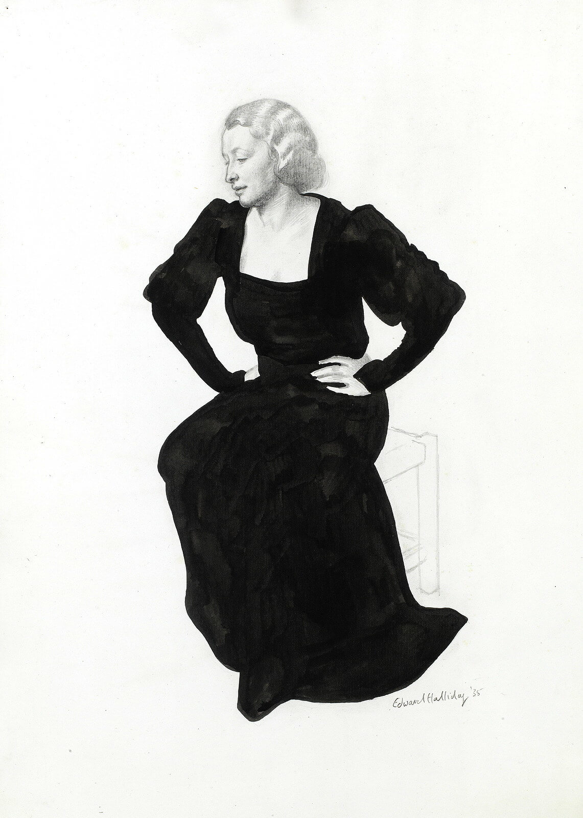 Portrait of a woman seated, three quarter view, black evening dress, 1935