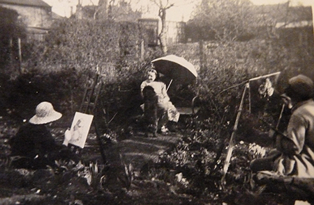 Florence Dunbar (Evelyn’s mother) and her sister Clara Cowling, both originally from Bradford, painted with the energy of the enthusiastic amateur, Clara perhaps more adventurously than Florence, who found her niche in endless floral still-lifes. The attribution of this portrait of Dunbar, relaxing in a pink dress under a parasol in the garden at The Cedars (the family home in Strood), is authenticated by a photograph in the Dunbar family album of Clara Cowling painting it. The photograph also shows Paul, the Dunbars’ dog, trying to jump up on to Evelyn’s lap, something perhaps beyond the reach of her Aunt Clara’s brush.