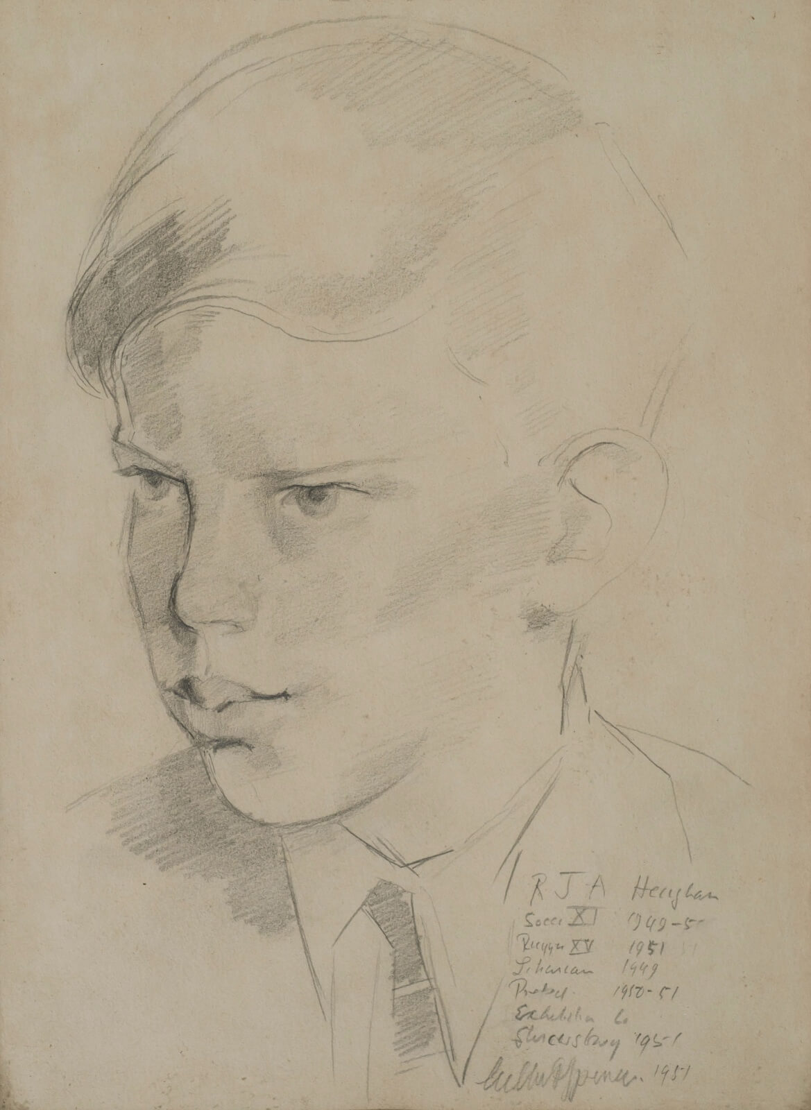 This pencil portrait is one of a series that Gilbert Spencer drew of portraits of boys from St Anselm’s School, Derbyshire.