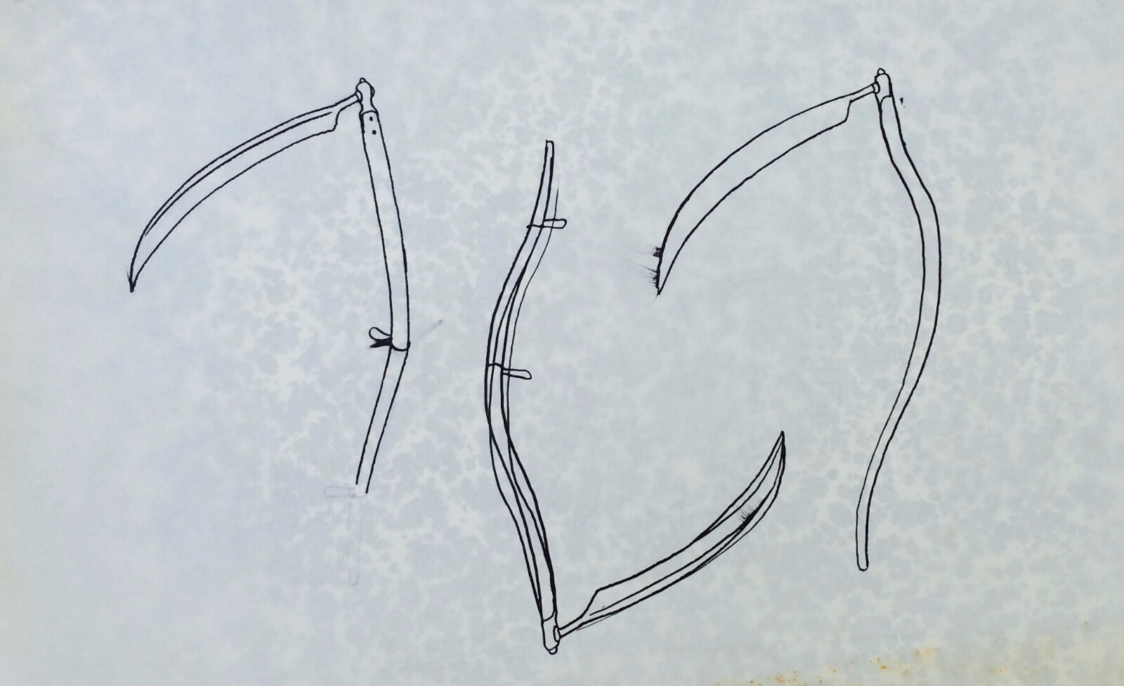 Preparatory studies of scythes, possibly intended for inclusion in A Farm Dictionary (Evans Bros., London, 1953), written by Derek Chapman and illustrated by the artist. 1952/3.