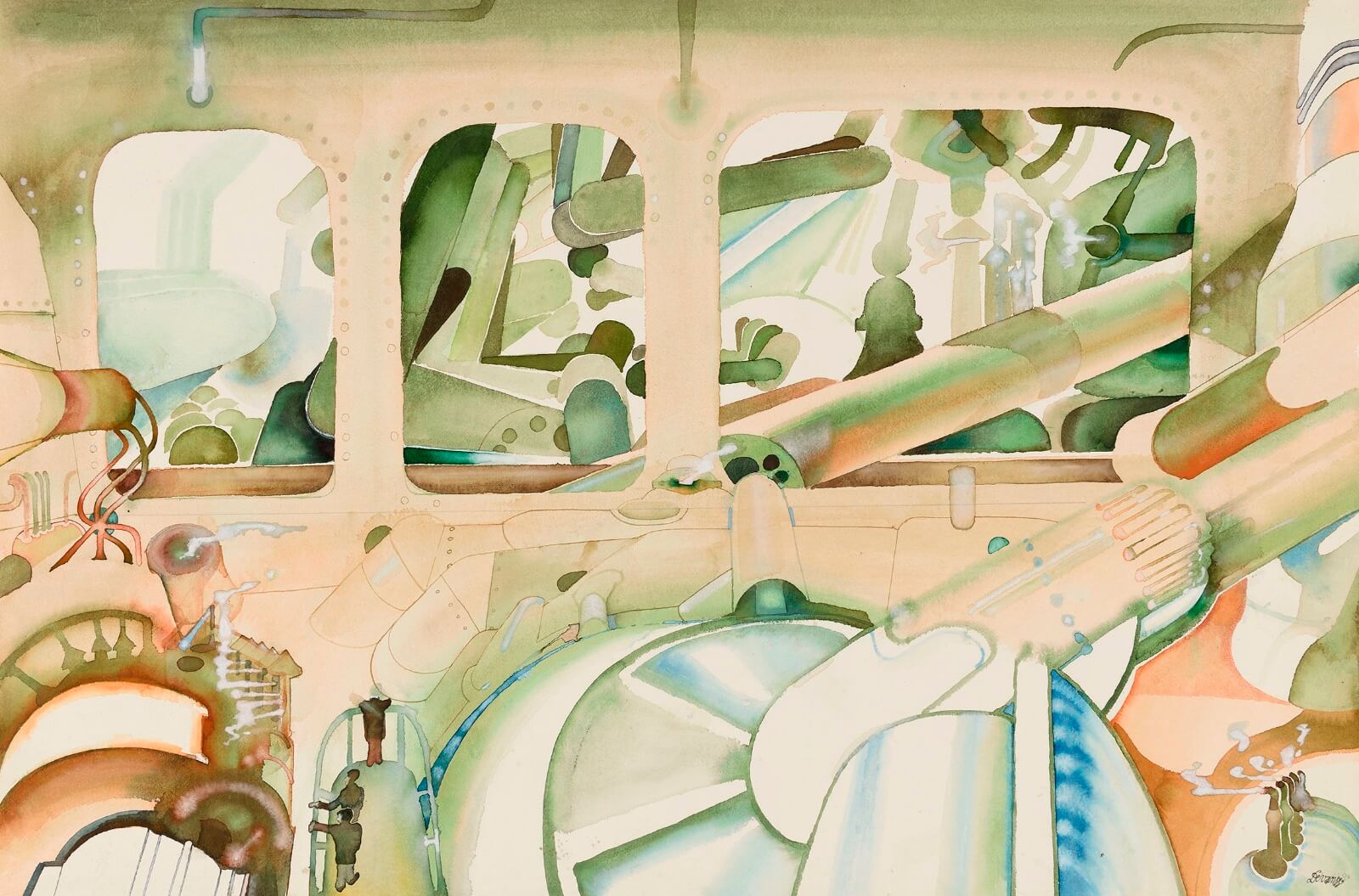 The highly distinctive large scale watercolours of David Evans have much in common with those of Edward Burra, who, twenty four years his senior and much admired by Evans, was clearly an important influence. Painting the landscape of his native Suffolk, where he settled (near Woodbridge) in 1969, his brightly coloured compositions, which typically measure 30 x 50 inches, fused his local habitat with vivid fantasies inspired by imagery from contemporary life.