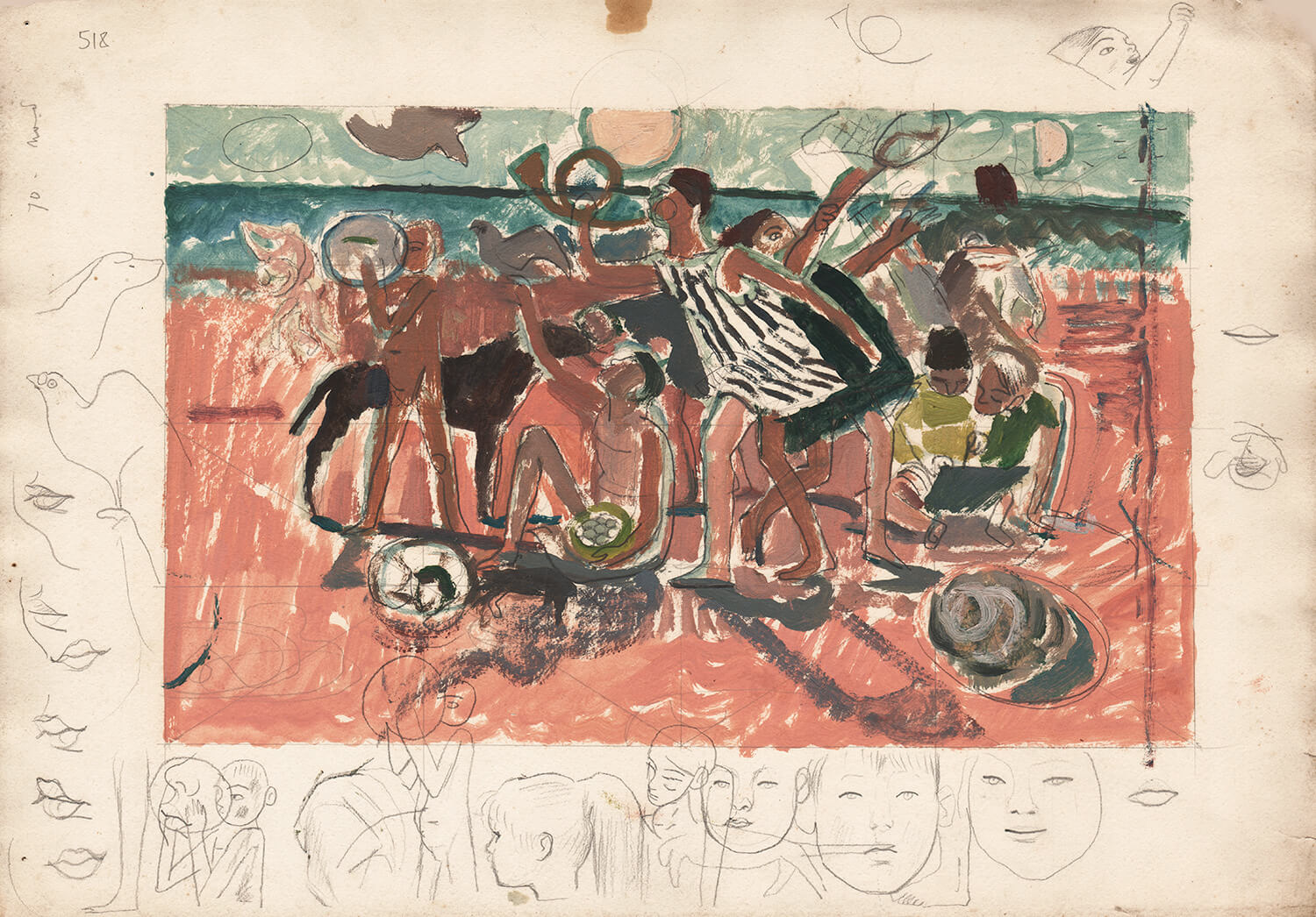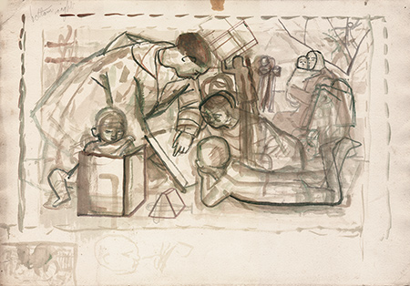 Sheet of unconnected sketches. Pencil, crayon c.1954