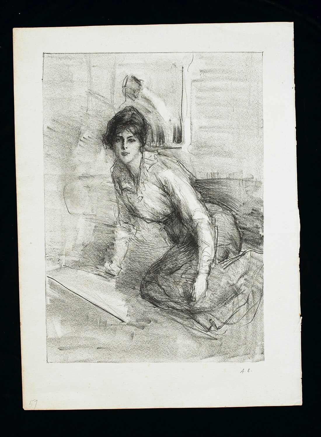 Although born in Wales, he was the son of the Marquis de Belleroche, of one of the most ancient French noble families who, being Huguenots, had fled to England in 1685. In 1871, following the death of his father, he moved back to Paris with his family. After he had finished school there, he studied at the studio of Carolus Duran, and spent long hours copying at the Paris museums. He soon became familiar with the leading painters and intellectuals of the day, and became a founder member of the Salon d’Automne, exhibiting alongside the Impressionists and associating with Emile Zola, Oscar Wilde, Albert Moore, Renoir, Degas, Helleu and Toulouse-Lautrec. Toulouse-Lautrec and Belleroche were exact contemporaries, who first met at the age of eighteen. Belleroche painted Toulouse-Lautrec’s portrait and shared with him a passion for the model Lili, who epitomised the Belle Epoch aesthetic of Toulouse-Lautrec’s most celebrated posters. Lili became Belleroche’s favourite model and mistress. In 1882 Belleroche also met the already acclaimed American painter John Singer Sargent, who recognised Belleroche’s talent and empathised with his free drawing style and sensitivity to light. They became life-long friends. Sargent’s handling of pastel was a great inspiration to Belleroche, while Belleroche’s sensitivity to tone and creation of form through the modeling of light exerted a strong influence on Sargent. In 1900, Belleroche became fascinated by the medium of lithography and by 1905 he was a leading figure in the field of lithographic portraiture. A.M. Hind, a former keeper of prints at the British Museum, described his works in lithography as “amongst the greatest achievements of the craft since its discovery.”
