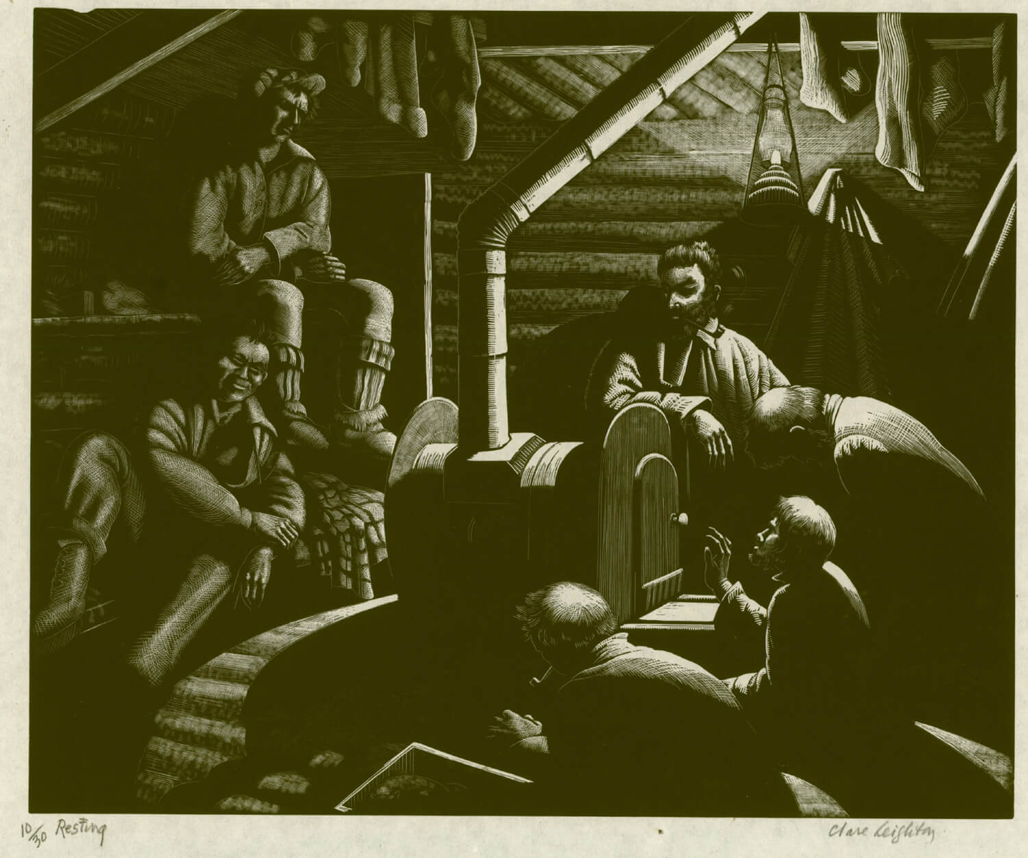 Chapdelaine‚Äùas an introduction to life in rural Quebec. The contrast between sparkling white snow and the darkness of the dense Canadian woods seemed especially suited to her favourite medium, and people at work had always been a favoured subject. At first the men of the camp were suspicious of this lone woman. However, when she hid any fear at the howling of wolves and shared the men’s food and some of their hardships she won their respect. They told hertheir fantastic tales of Paul Bunyan, ‚Äúthe god of the lumberjacks‚Äù, and she was able to make numerous pencil sketches and notes. Clare’s diary, written at the time and copied word-forword below, shows her first impressions in a peculiarly immediate form. These notes and the sketches were the basis for her subsequent engravings on the boxwood blocks. The prints depict the lumberjacks’ life at a time when the only power in the remote forest lay in the muscles of men and horses.