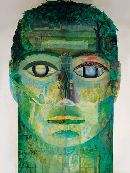 The two most impressive murals Barbara Jones produced were of gigantic heads, the first commissioned by the Central Office of Information for an International Labour Office exhibition in Turin celebrating the centenary of the Italian State (1961), the other for Philips Research Laboratory in Eindhoven (1966). These were not only striking because of their size but because of the way Jones chose to interpret her briefs. The Philips’ mural, entitled Man and his Senses, is a relatively straightforward strong image, with enlargened fingertips, mouth, nose, eyes and ears filled with patterned neurons and synapses, only weakened by the somewhat sentimental placing of a rose outside the head.