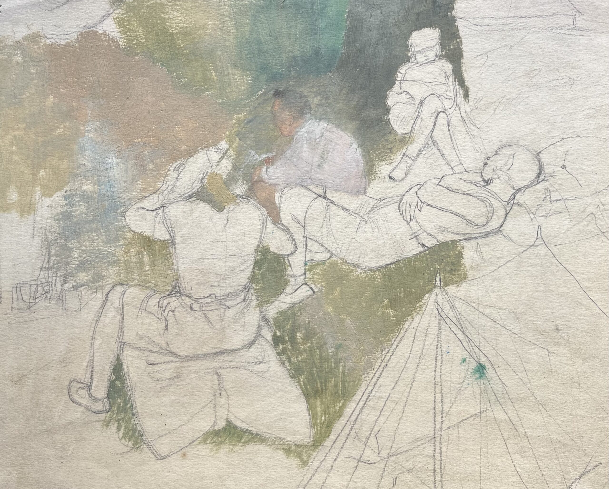 In July 1930 Dunbar and some fellow first year Royal College of Art students, all members of the RCA Sketching Club, spent a week under canvas preparing a portfolio of outdoor pictures for exhibition the following December. The week was supervised by a so far unidentified tutor, here seen in the upper centre wearing a pale blue shirt.