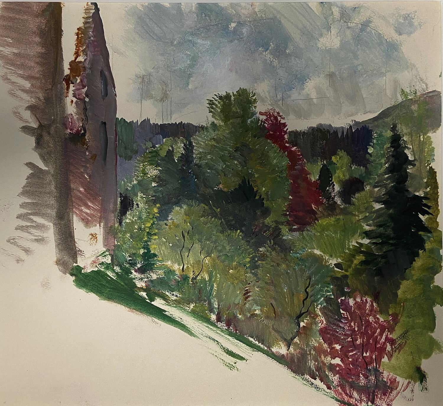 Cundall’s working technique was dependant upon sketching on the spot to create images that would later be worked up into larger paintings in the studio. Here one would find him working form many drawings and colour notes accumulated during some recent journey. He prefers working with such aids to memory, on a fine canvas with soft hog and sable brushes, occasionally using a palette knife, and laying on colour instinctively rather than by methodical system. (William Gaunt, Charles Cundall R.A, A Study of his Life and Work).