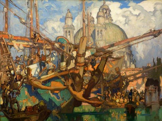 A few etchings have very important names, though the subjects that these names ask us to see, are almost hidden by boats or barges. This joke has been noted by many writers. Frank Newbolt says, for instance: “‘The Porte St. Croix at Bruges,’ that massive structure of town defence, is dwarfed by enormous barges”; and Henri Marcel is struck by the “Santa Maria della Salute”, seen behind the masts and rigging of tall ships fastened to groups of piles. On our right a medley of picturesque anchors and cranes makes a complicated framing for Santa Maria, whose leaden domes stand out rather clearly against the sky. I like this genre. Not only does it blend architectural motifs with sailoring and commercial activities; it suits Brangwyn, and discovers him as much as he discovers its charm and variety.