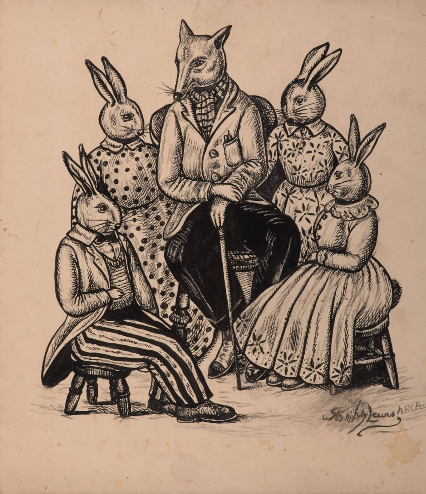 Seated fox surrounded with rabbits, circa 1950