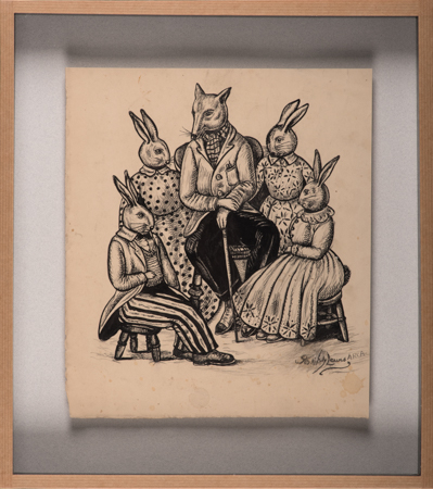 Stanley Lewis (1905-2009) was reluctant to sell his art during his life-time. He kept all his major works. He later gave some to museums. He turned down offers from galleries, preferring to work without constraints, choosing to earn a much needed regular income through teaching (over 10 years at Newport School of Art and 22 years as Principal of Carmarthen School of Art). Stanley’s art has period charm. It occupies a backwater (rather than the mainstream) of British Art – this is the unmapped territory that art historians will increasingly look at as accounts of 20th Century British Art are revised. His work is highly distinctive and he remained faithful throughout his life to a graphic and stylised manner developed early on in his career. Perhaps the most enduring aspect of his legacy is the remarkable cycle of paintings exhibited at the Royal Academy celebrating Welsh subjects: The Welsh Dress, The Welsh Mole Catcher, The Welsh Farmer, and The Welsh Dresser. There is arguably no other series of genre paintings in British Art which capture so evocatively Welsh identity. Stanley also strongly identified with the land: on the one hand his calling to art was a vocation; on the other his approach was disarmingly unpretentious: ‘I must admit instinct has kept me on the straight-and-narrow path to carry on working my art into what I am: I am a farmer’s son and I have never craved to be in any one else’s shoes.’ Stanley produced little in the way of major paintings during the last decades of the 20th century, though he did continue to draw, (often reworking earlier drawings), and increasingly put his energy into producing and publishing his book illustrations. In his 101st year, in 2006, Stanley published a last edition of drawings under the title: Adventures in Animal Town, using computer software (Photoshop) to add colour to the remarkable images which half a decade earlier, in black and white, had graced the pages of the South Wales Evening Post. (Fig. 2) Stanley first contacted Liss Fine Art (by email!), aged 101, wanting to know what had happened to his former mentors Thomas Monnington and A.K. Lawrence. Stanley’s career spanned a large part of the 20th century. Yet the fruit of his labour was never publicly exhibited. This is the first ever exhibition of his work. Stanley put his longevity down to cigars, whisky and Michelangelo. He took great pleasure in helping prepare the notes in this catalogue. Recalling events from between 50 and 90 years ago it is remarkable how accurate his memory proved to be. It is sad that Stanley is not alive to see this exhibition. Asked, age 103, if he was finally ready for his first ever show, or whether he would like a little more time to prepare, he inhaled gently on his cigar and, with a puff of smoke and a faint chuckle, said: ‘I think I am ready’. The day before he died he asked Jenni his daughter to type up his final wishes: ‘… And when my exhibition is up and running, open a good bottle of champagne and celebrate and think of me. No doubt I will be there in spirit to keep an eye on things.