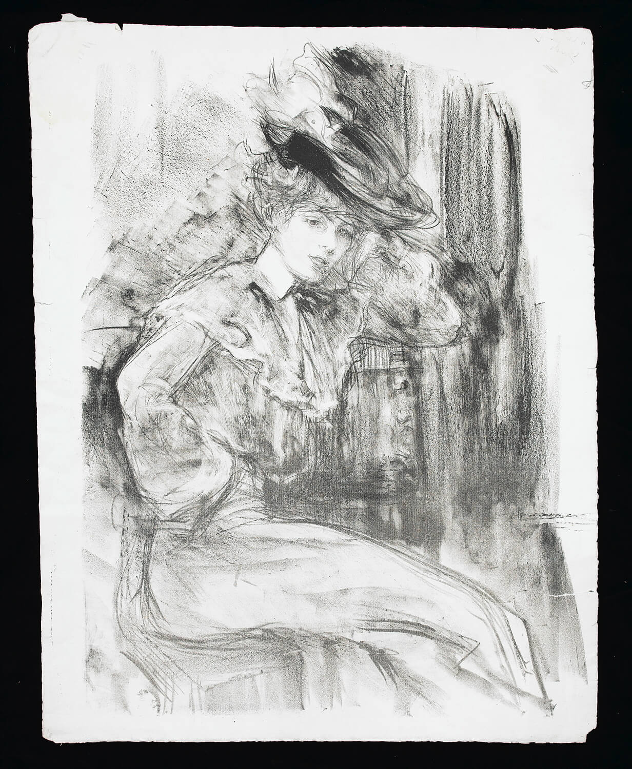 Although born in Wales, he was the son of the Marquis de Belleroche, of one of the most ancient French noble families who, being Huguenots, had fled to England in 1685. In 1871, following the death of his father, he moved back to Paris with his family. After he had finished school there, he studied at the studio of Carolus Duran, and spent long hours copying at the Paris museums. He soon became familiar with the leading painters and intellectuals of the day, and became a founder member of the Salon d’Automne, exhibiting alongside the Impressionists and associating with Emile Zola, Oscar Wilde, Albert Moore, Renoir, Degas, Helleu and Toulouse-Lautrec. Toulouse-Lautrec and Belleroche were exact contemporaries, who first met at the age of eighteen. Belleroche painted Toulouse-Lautrec’s portrait and shared with him a passion for the model Lili, who epitomised the Belle Epoch aesthetic of Toulouse-Lautrec’s most celebrated posters. Lili became Belleroche’s favourite model and mistress. In 1882 Belleroche also met the already acclaimed American painter John Singer Sargent, who recognised Belleroche’s talent and empathised with his free drawing style and sensitivity to light. They became life-long friends. Sargent’s handling of pastel was a great inspiration to Belleroche, while Belleroche’s sensitivity to tone and creation of form through the modeling of light exerted a strong influence on Sargent. In 1900, Belleroche became fascinated by the medium of lithography and by 1905 he was a leading figure in the field of lithographic portraiture. A.M. Hind, a former keeper of prints at the British Museum, described his works in lithography as “amongst the greatest achievements of the craft since its discovery.”