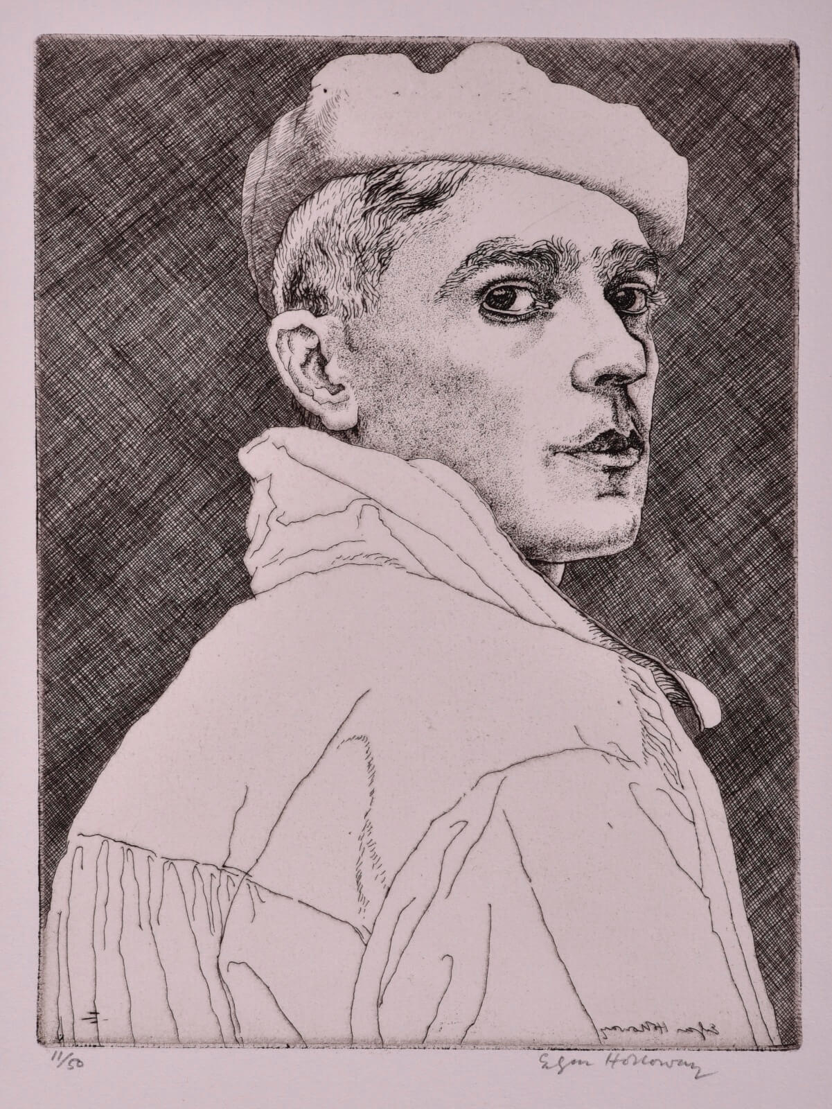 Holloway made more etched self portraits than any other British printmaker. His first self portrait was a drypoint of 1931, aged 16; The Fedora, his 33rd, was etched in 2002, at the age of 88.