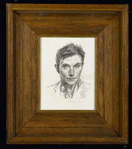 This pen and ink drawing by Geoffrey Rhoades was the original design for his self- portrait wood engraving of 1941. When Rhoades left the Slade School of Fine Art, (where he was a student from 1919-1923) Henry Tonks said: “You’ve something I haven’t ‚Äì imagination‚Äù. During the Second World War, he lived close to and was friends with the group of artists, including Eric Ravilious and Edward Bawden, who moved to Great Bardfield in Essex.