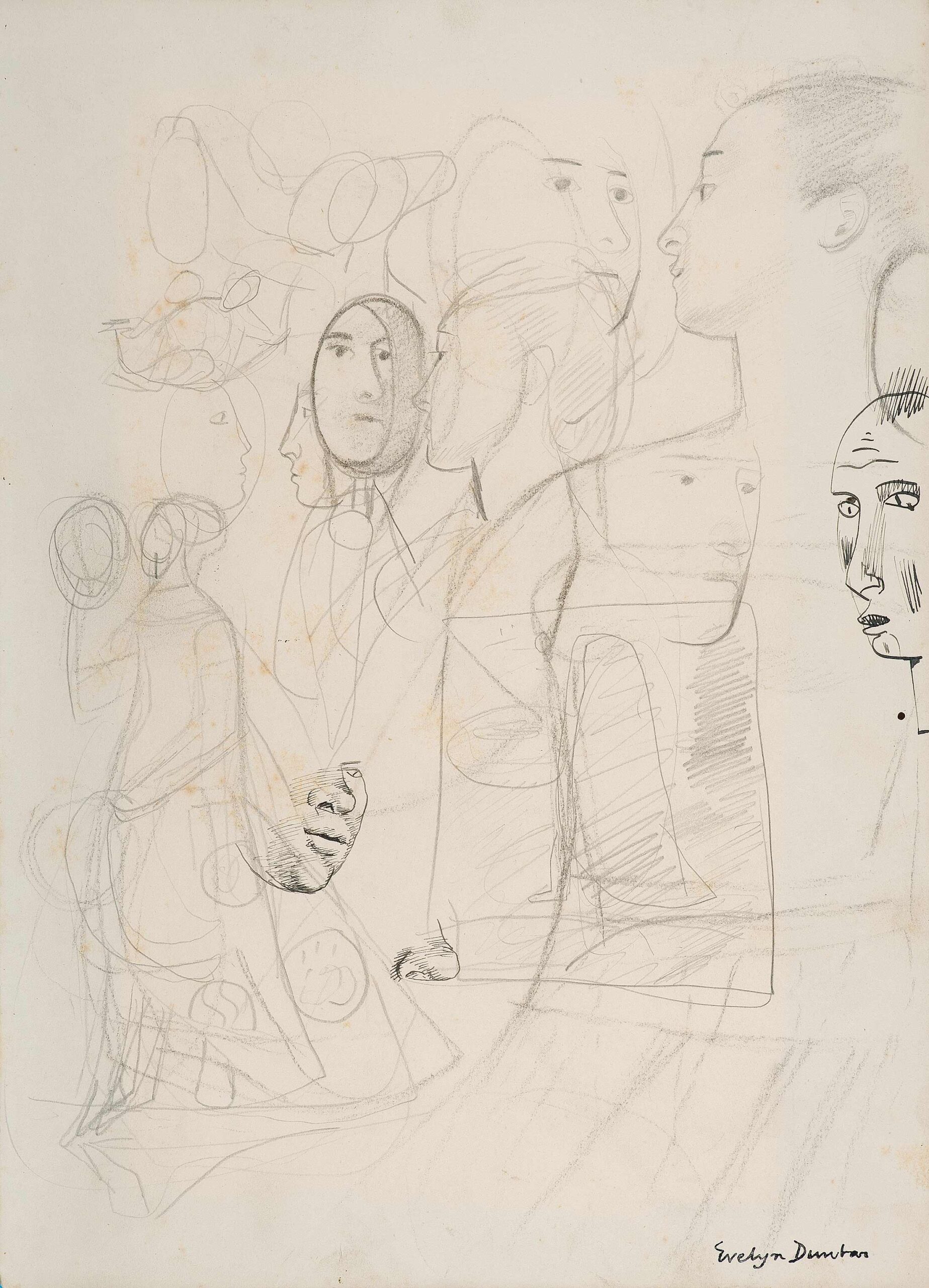 Sketches of men and women involved in various activities, of unknown purpose or destination