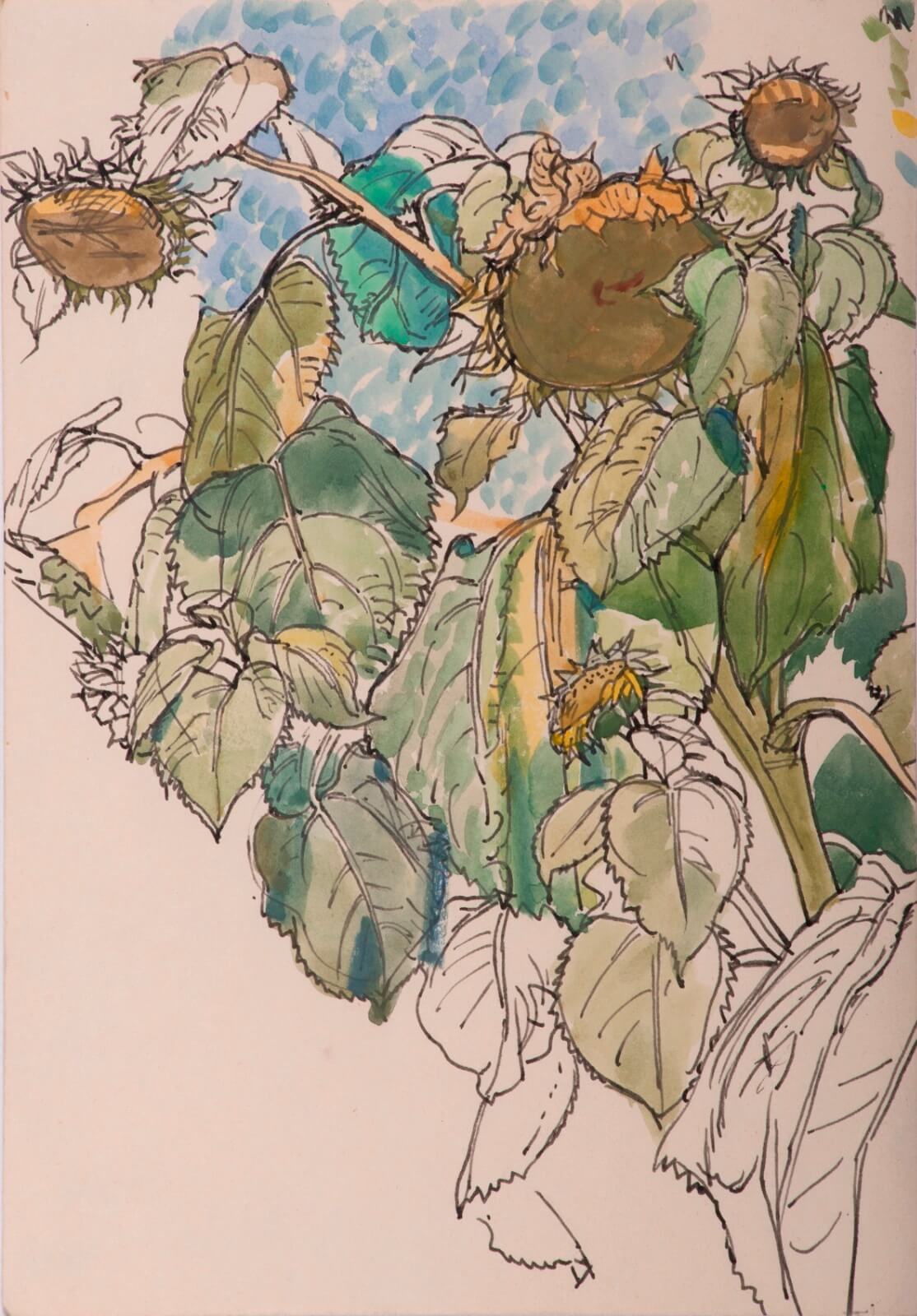 ‘The next year Edward (Bawden) planted numerous sunflowers. There was a row along the wall by the lavatory and half way up the garden, the cream of the collection, a monstrous double sunflower grew to huge maturity. So large and so splendid was it that looking up to its vast centre I felt that I should never be satisfied with any future sunflower I might grow, this was the limit.